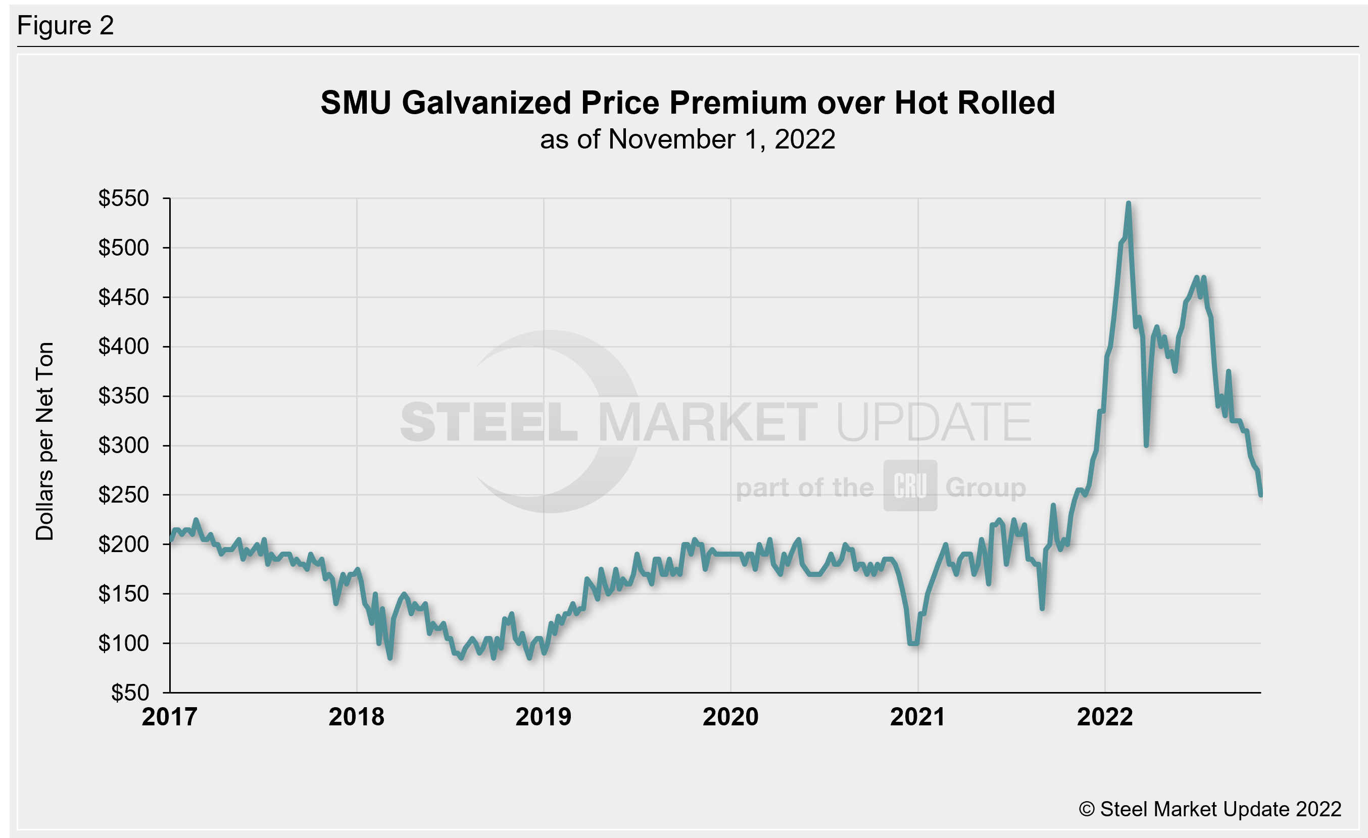 As shown in the graph below, galvanized held a premium between $80–220 per ton over hot rolled for the last few years, exceeding that range in late 2021. The premium rapidly rose to a peak of $545 per ton in mid-February, falling almost as quickly thereafter to reach a low of $300 per ton on March 22. After bouncing back up to the high $400s over the summer months, the premium has been declining since. The premium this week is $250 per ton, a 49-week low. The average premium in October was $290 per ton, down from $323 per ton in September and down from $355 per ton in August. November 2021 averaged $253 per ton, while November 2020 averaged $180.