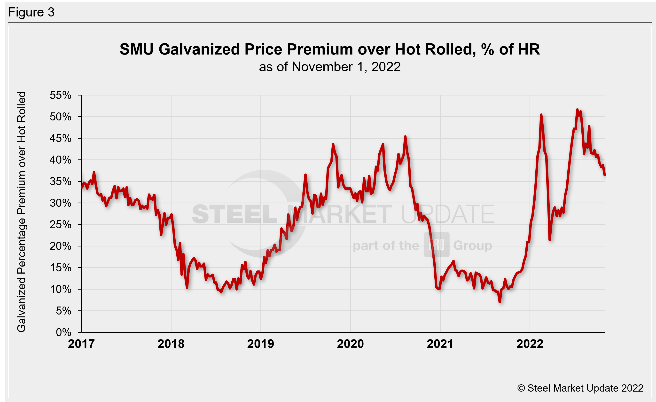To better compare these two products, we calculated the galvanized price premium over hot rolled as a percentage of the hot rolled price, as shown in the graphic below. This is an attempt to paint a clearer comparison against historical pricing data. The percentage premium is not as alarming compared to the dollar value premium, but it is still significantly higher compared to previous years. Galvanized prices held an average premium of 24% above hot rolled prices from 2017 through the end of 2021. In 2021, the premium averaged just 13%, while the first ten months of 2022 now average 38%. The premium reached a record high of 52% in July 2022. The latest premium has eased to 36%, but remains historically high. The average premium in October was 39%, down from 41% in September and 45% in August.