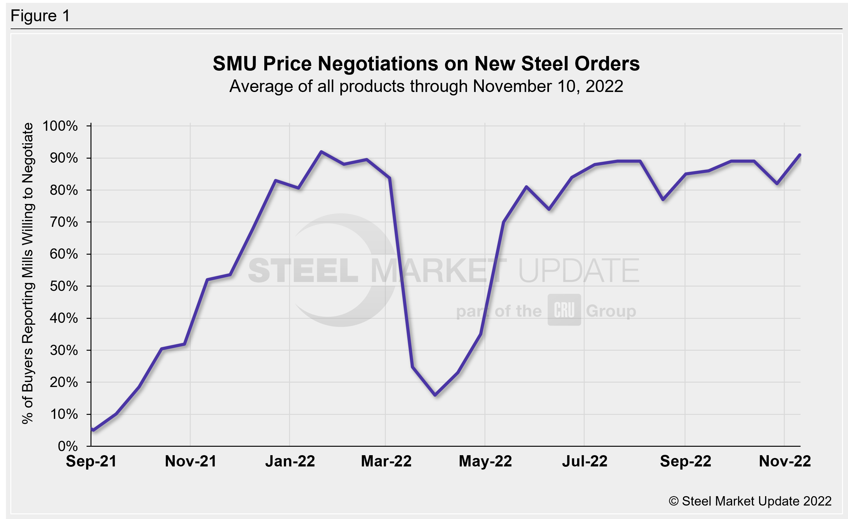 Steel Market Update asks hundreds of steel buyers every other week: Do you find domestic mills are willing to negotiate spot pricing on new orders? On average, 91% of steel buyers polled this week reported that mills were willing to negotiate lower prices on new orders. This is now the highest rate recorded since January. As shown in Figure 1, negotiation rates have remained relatively high for quite some time.