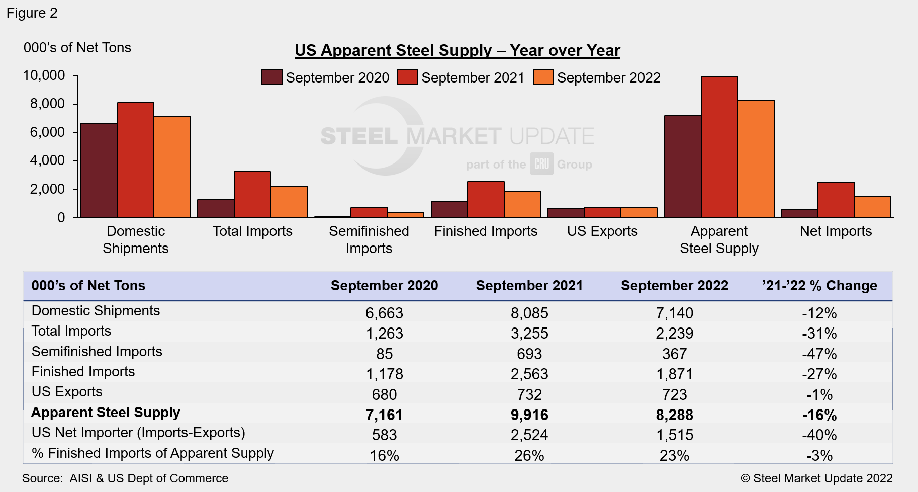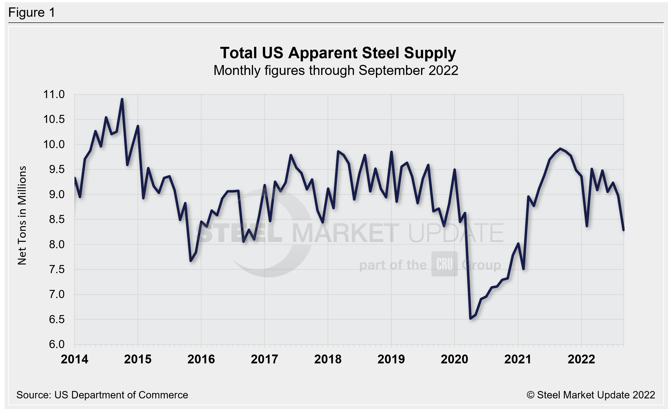 US apparent steel supply eased further in September, down 8% from August to 8.29 million net tons, according to data from the US Department of Commerce and the American Iron and Steel Institute (AISI). As the lowest monthly figure since February 2021, this was a 19-month low. September supply was 10% below the average monthly rate from the past year (9.21 million tons). Recall that supply reached a six-year high of 9.92 million tons one year ago, then declined each month through February.