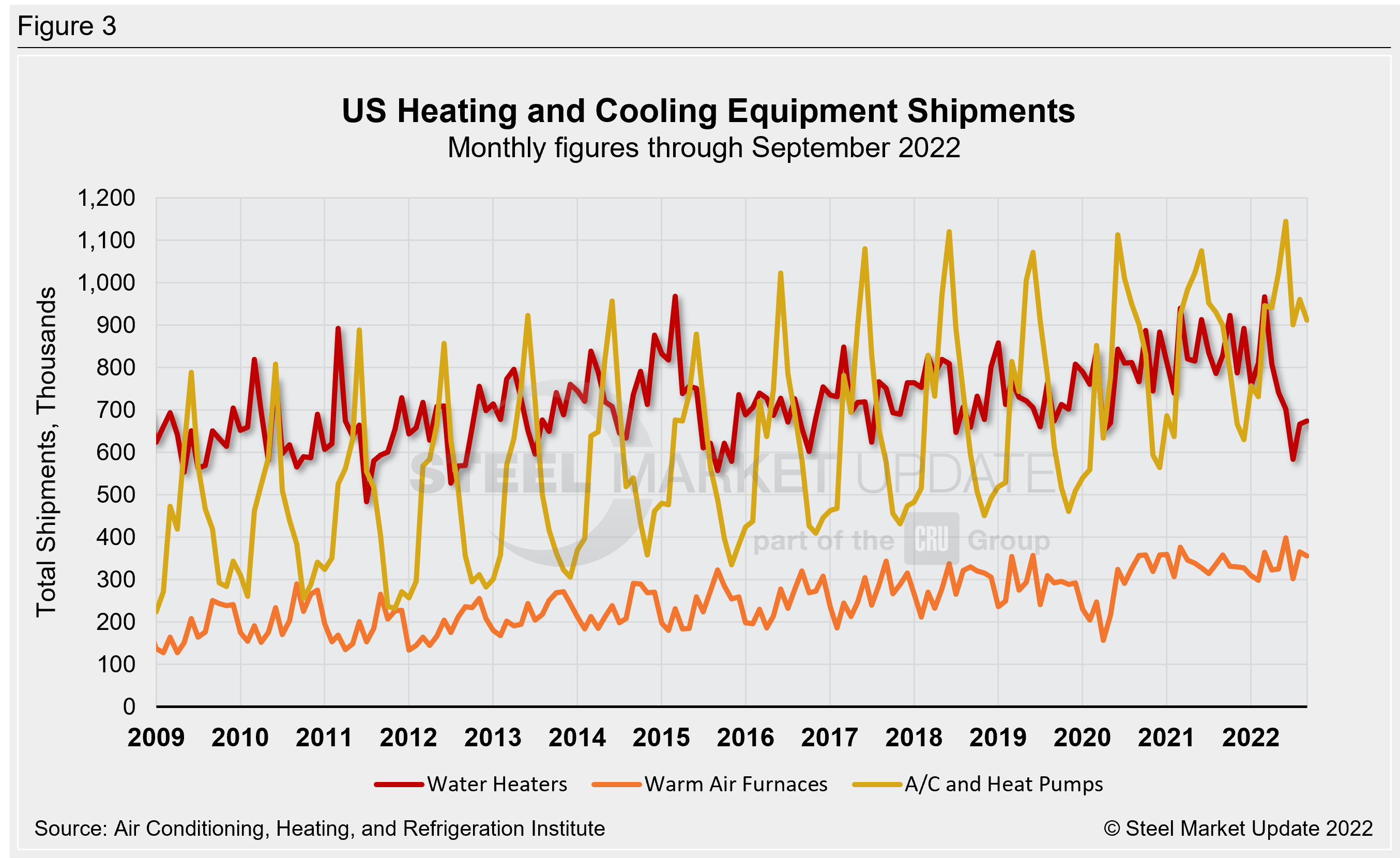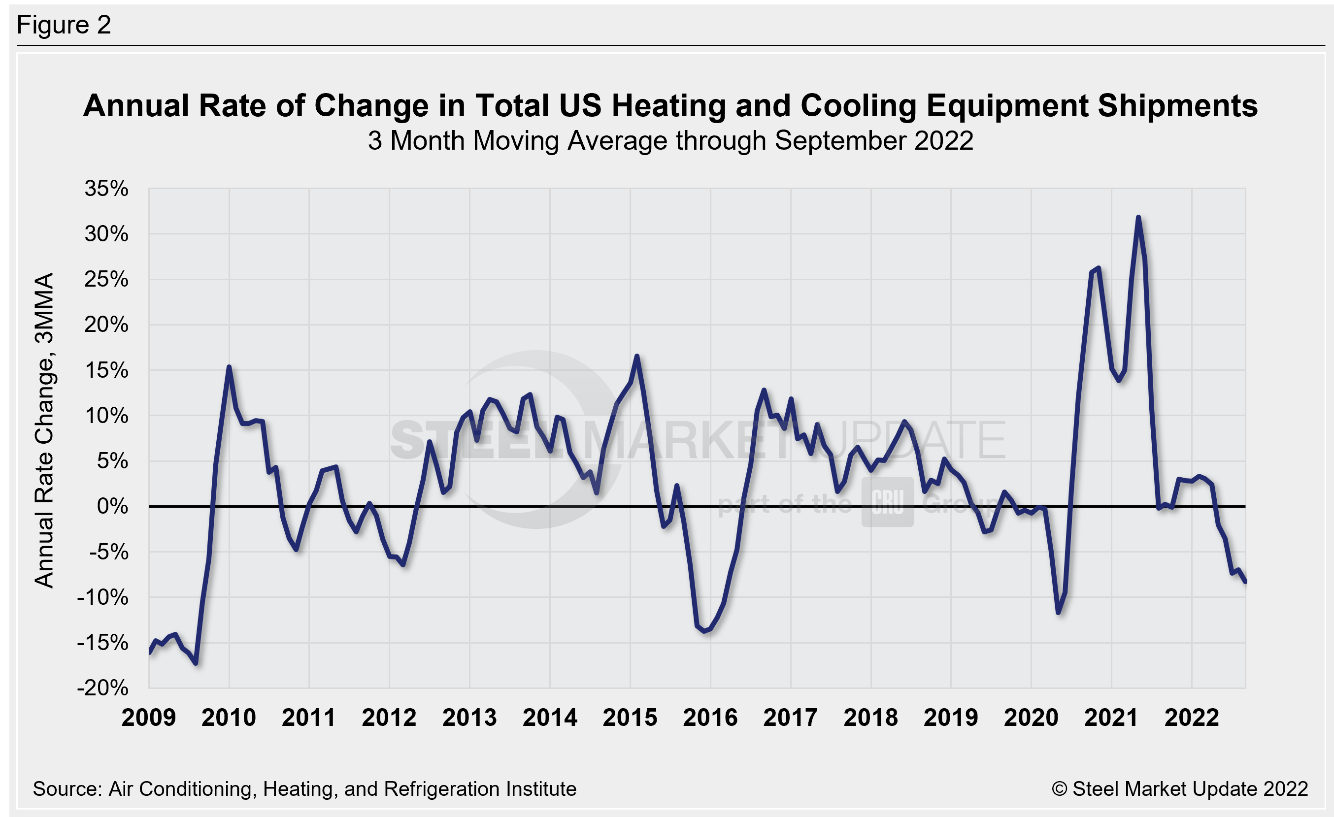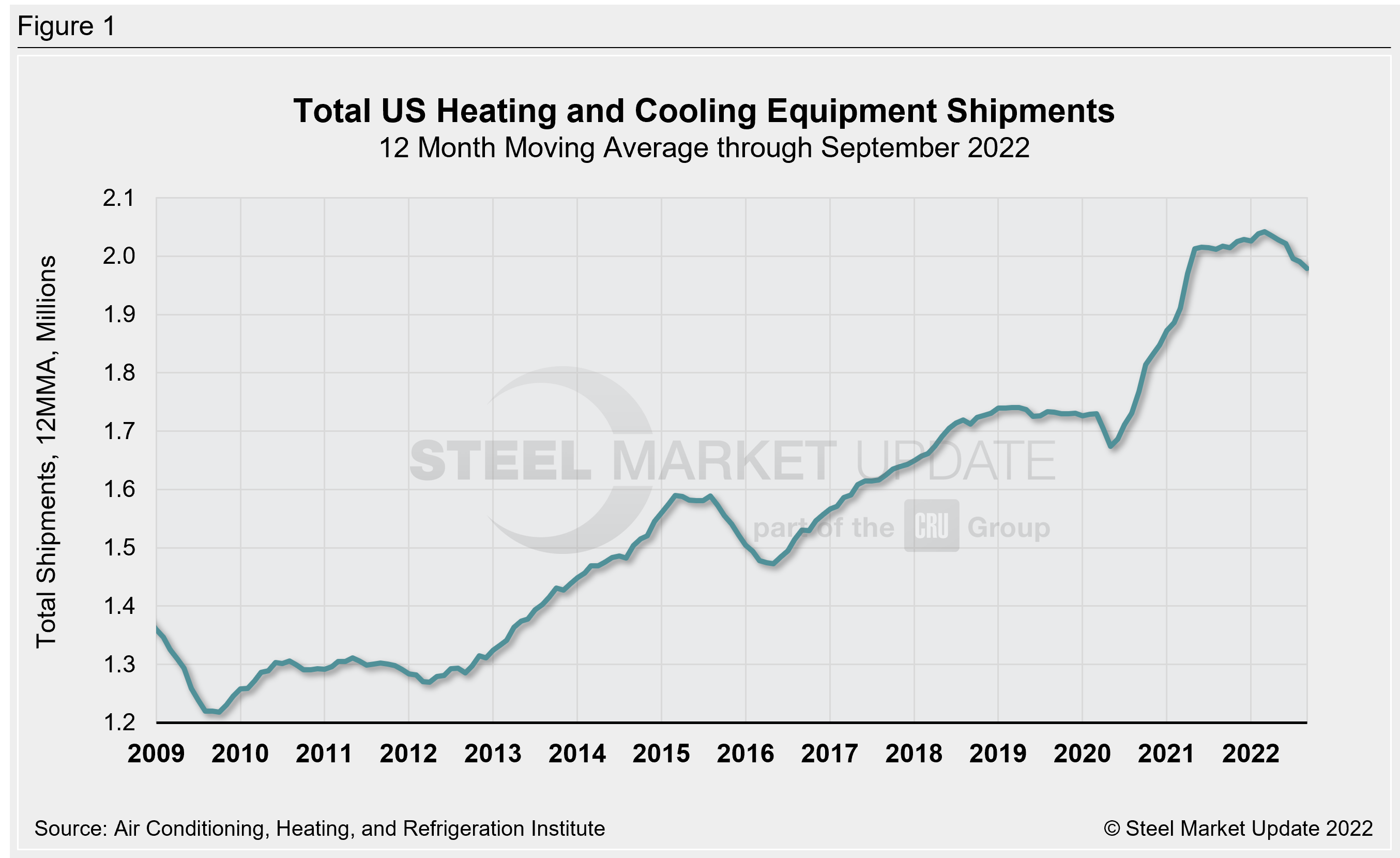An interactive history of heating and cooling equipment shipment data is available on our website. If you need assistance logging in to or navigating the website, please contact us at Info@SteelMarketUpdate.com.