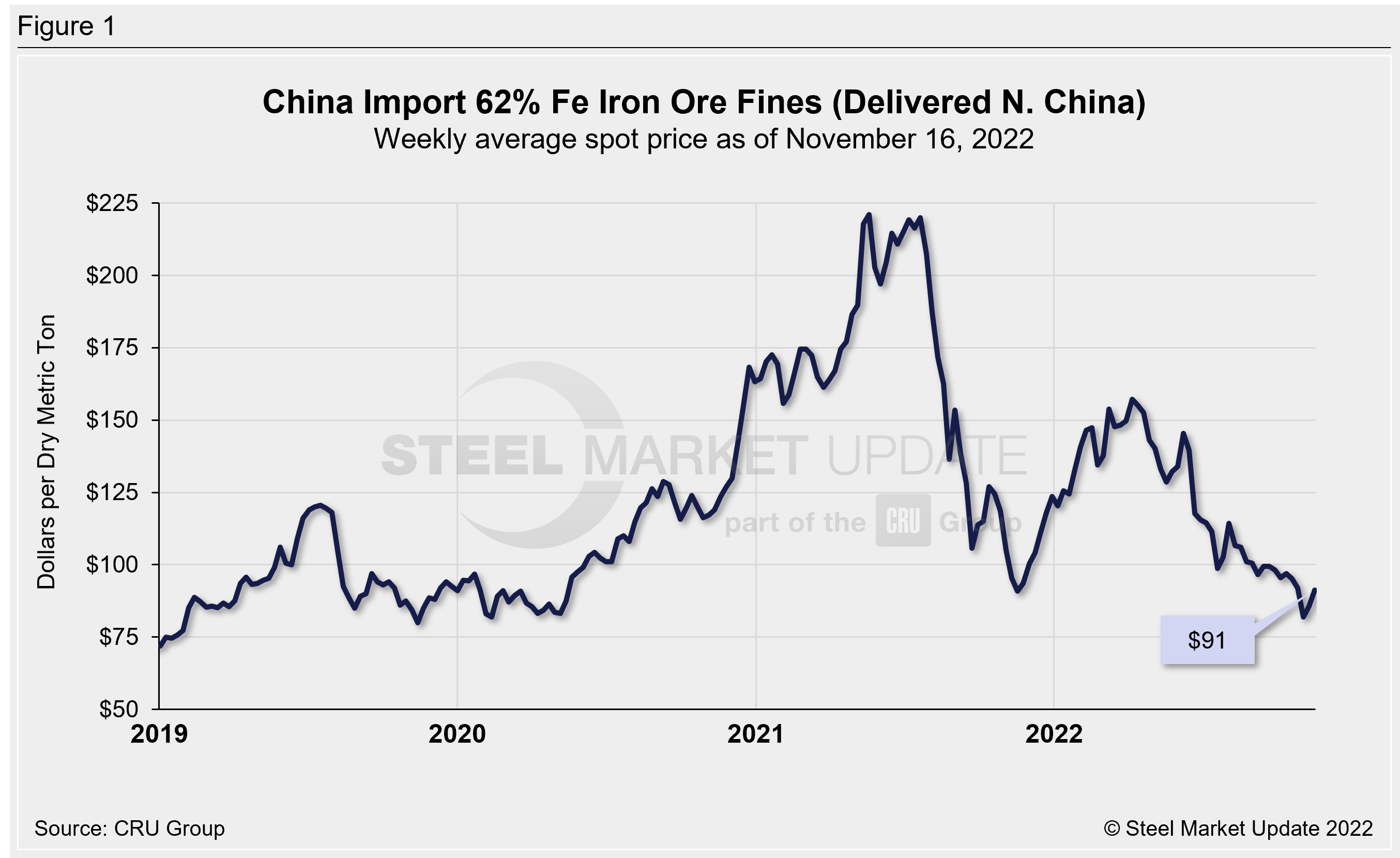 After rising to record-high levels last summer, the Chinese import price of 62% Fe content iron ore fines receded to pre-Covid levels by the end of 2021. Prices increased from late 2021 through April of this year but have since steadily declined. Figure 1 shows the price of 62% Fe delivered North China at $91 per dry metric ton (DMT) as of Nov. 16. Iron ore prices recently reached a 2.5-year low of $82 per DMT in early November. Prior to the last year, iron ore prices were last in this territory in May 2020. Prices have decreased 14% compared to levels three months ago and are 1% higher than prices one year prior.