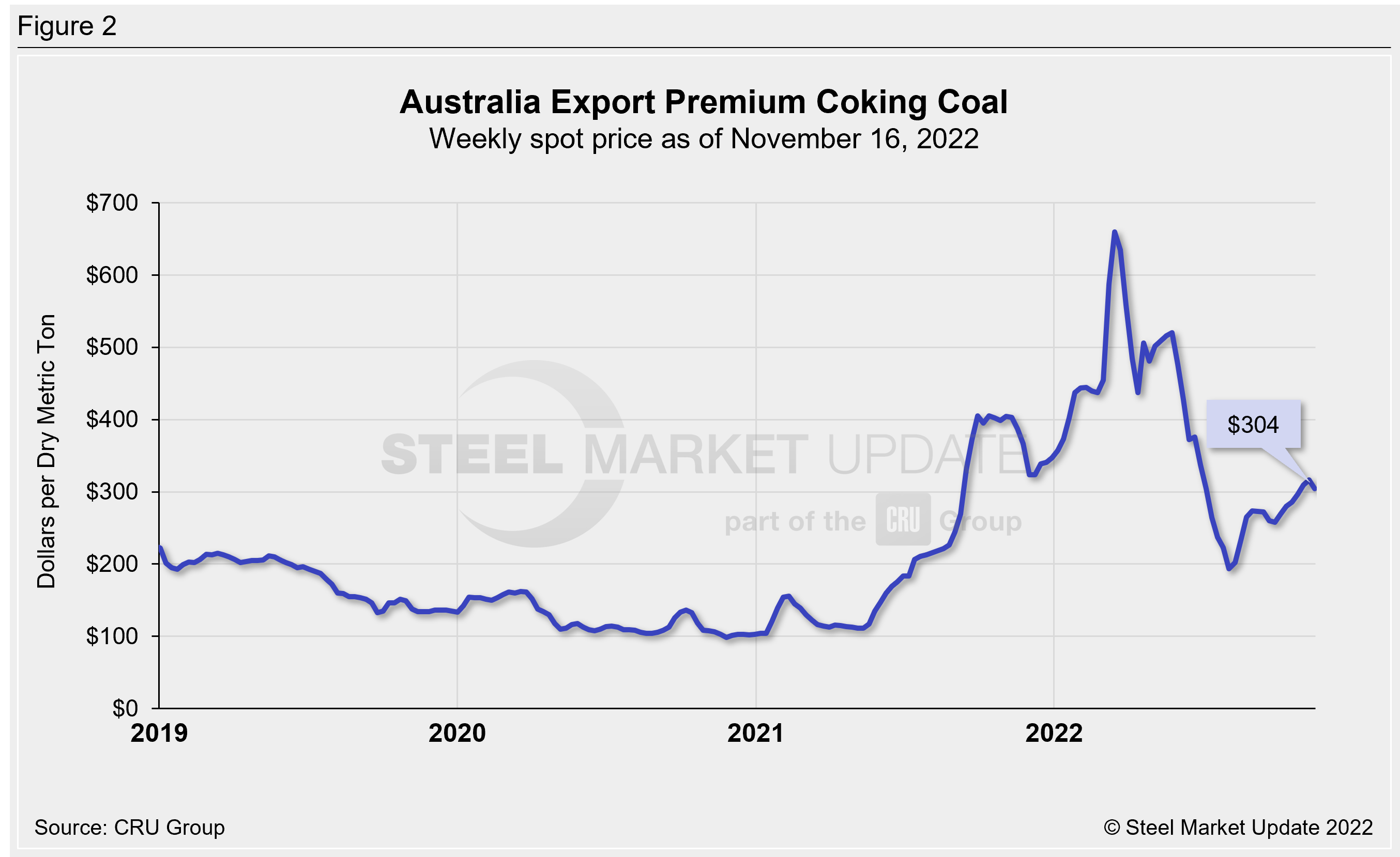 The price of premium hard coking coal FOB east coast of Australia surged in March of this year to a record high of $660 per DMT. Prices quickly declined in the following months, falling to a 13-month low of $193 per DMT in early August. Prices have since ticked back up; the latest price as of Nov. 16 is $304 per DMT. This is up 57% from the early-August low, but down 54% from the March peak (Figure 2). Prices are up 31% compared to three months prior, but down 22% from prices one year ago. For comparison, the average coking coal price between 2017–2020 was $172 per DMT.