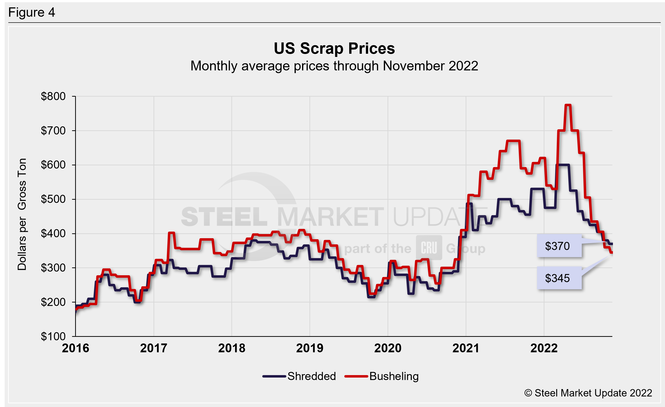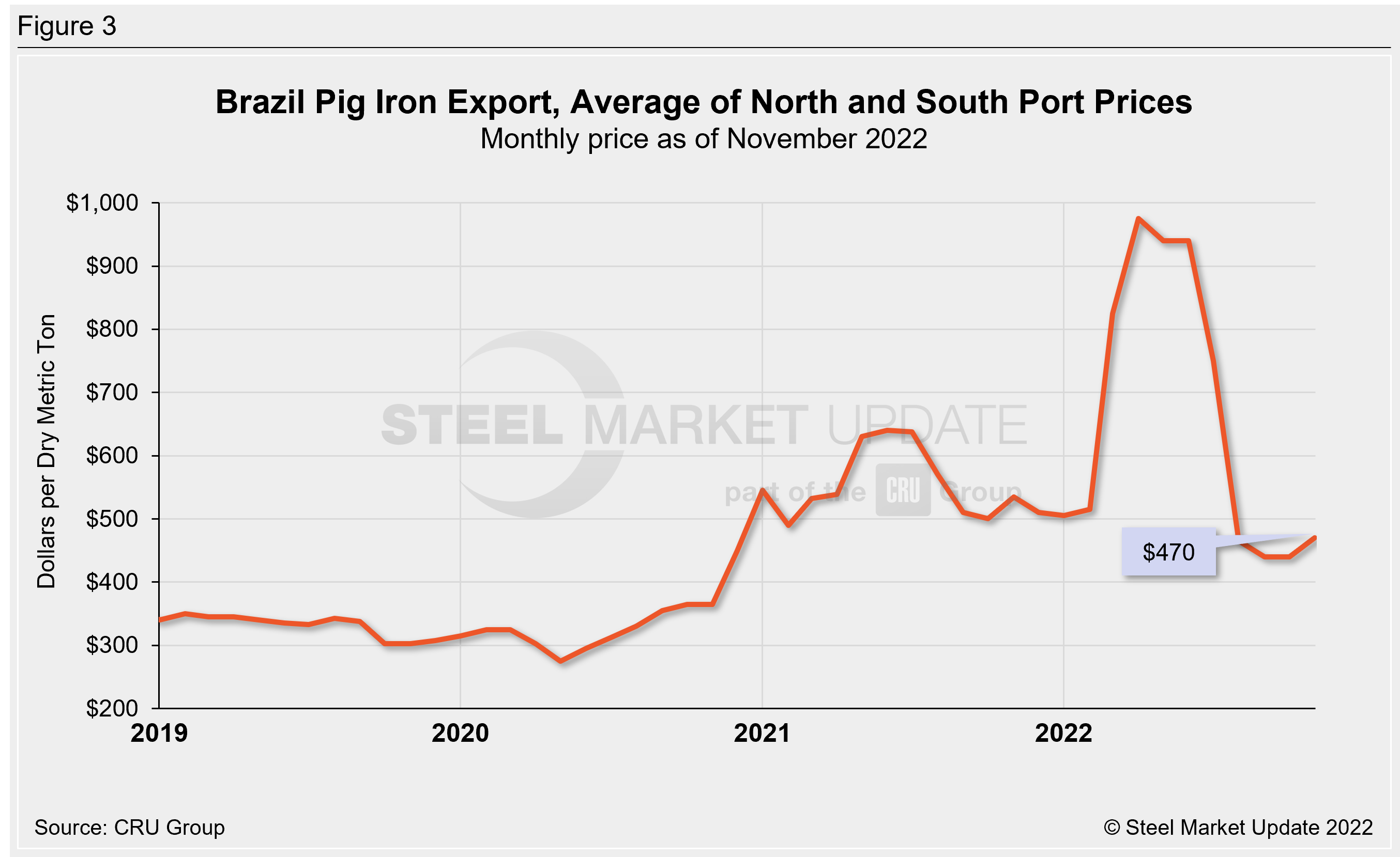 Pig iron prices had remained elevated but stable for most of 2021 and early 2022. Prices jumped 60% in March following the invasion of Ukraine by Russian forces, which limited or halted supplies from both nations. April saw record-high pig iron prices of $975 per DMT. Prices eased each month throughout September to reach a low of $440 per DMT. Prices through November are up 7% to $470 per DMT, in line with prices three months ago and down 12% from levels one year prior. Recall that pig iron prices reached a multi-year low of $275 per DMT back in June 2020 (Figure 3).
