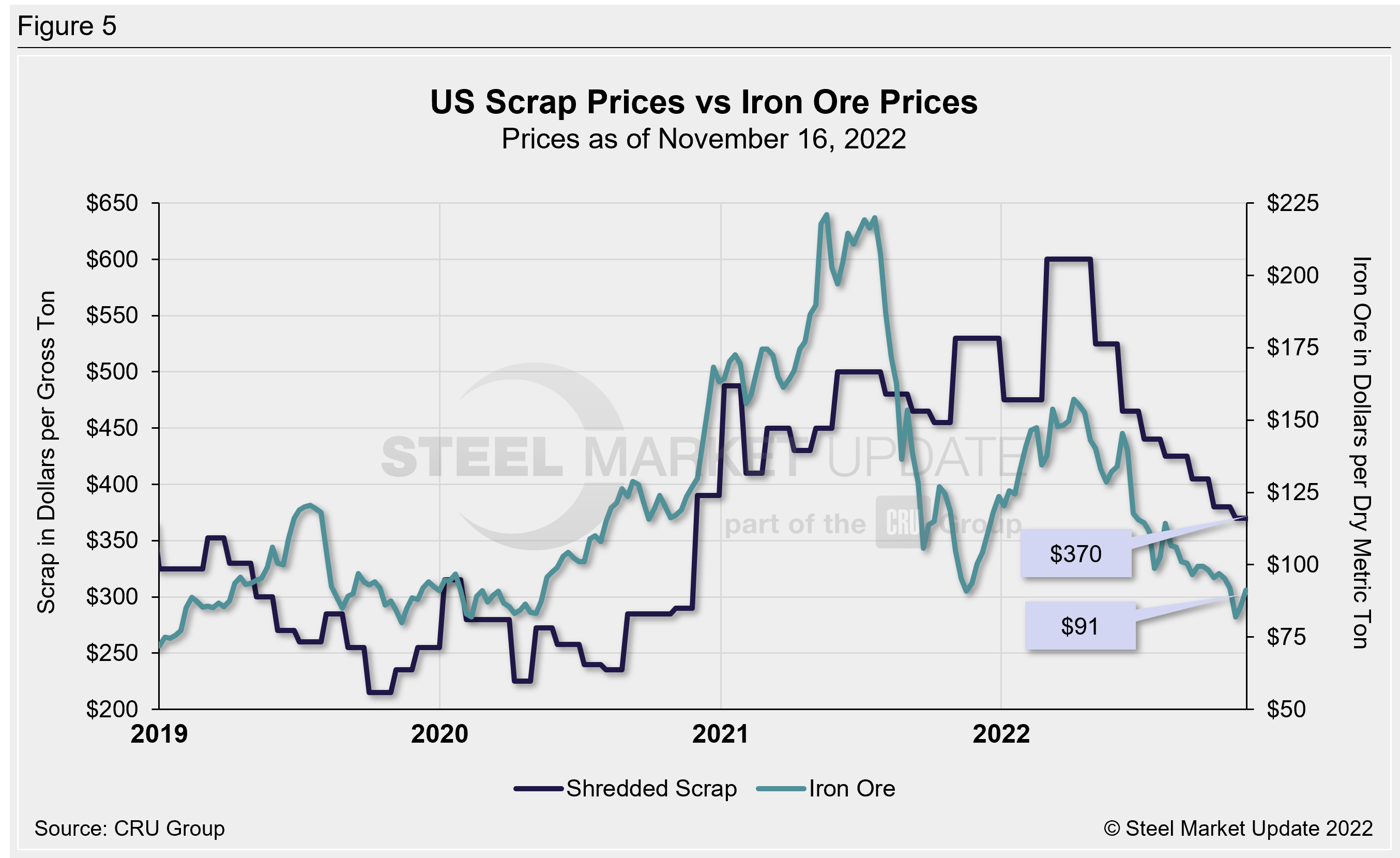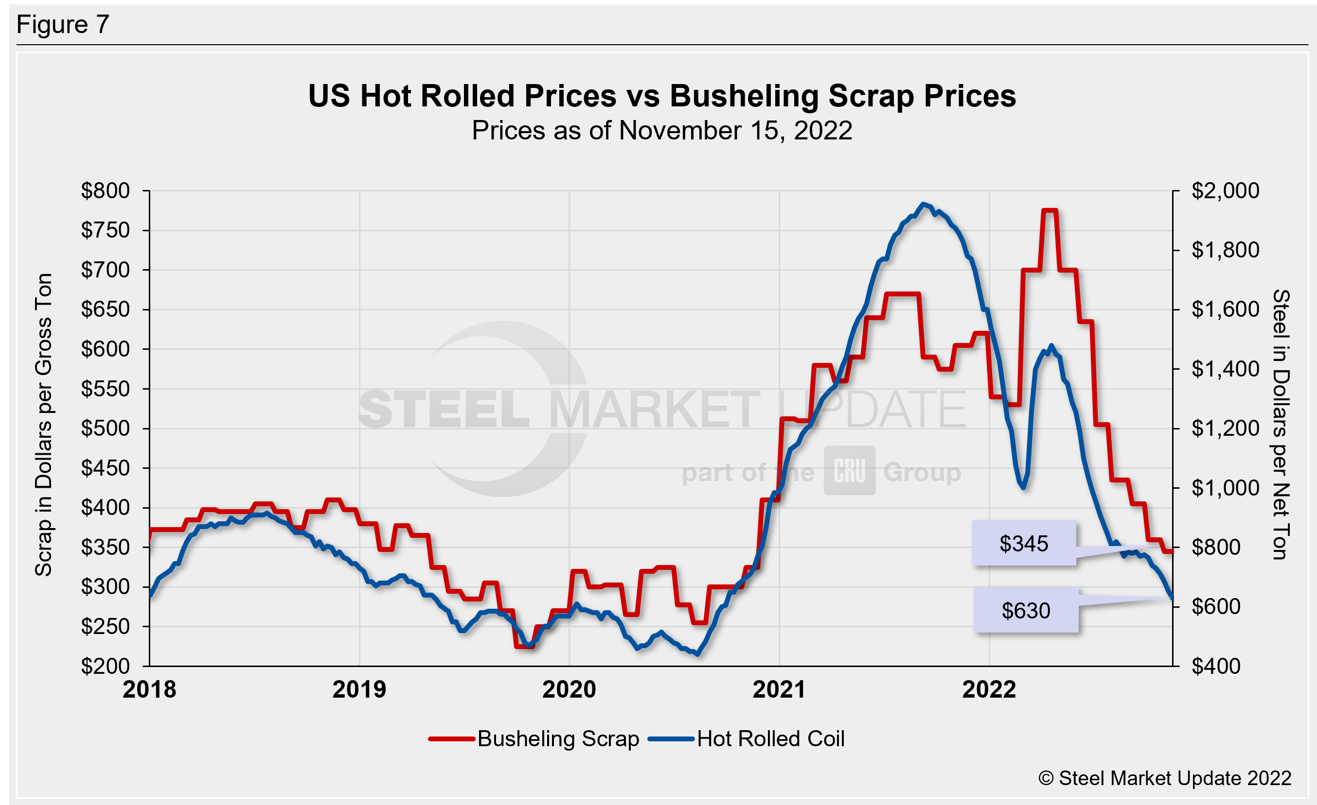 Figure 7 shows how the price of hot-rolled steel relates to the price of busheling scrap. Busheling has declined $430 per gross ton (55%) from the April peak and is back in the pre-pandemic ballpark. As of Tuesday, Nov. 15, the SMU hot rolled price average decreased $25 per ton week-over-week to $630 per net ton. This is down $850 per net ton (57%) from the April 2022 peak, and the lowest price recorded since September 2020.