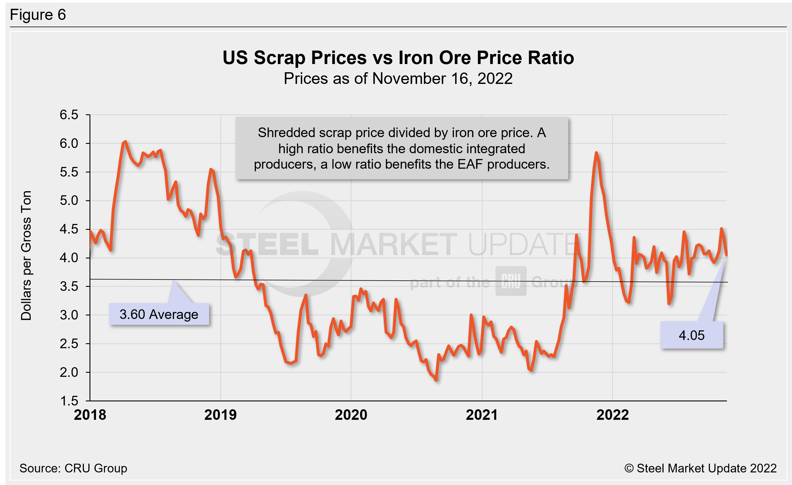 To compare the two, SMU divides the shredded scrap price by the iron ore price to calculate a ratio (Figure 6). A high ratio favors the integrated/BF producers and a lower ratio favors the minimill/EAF producers.