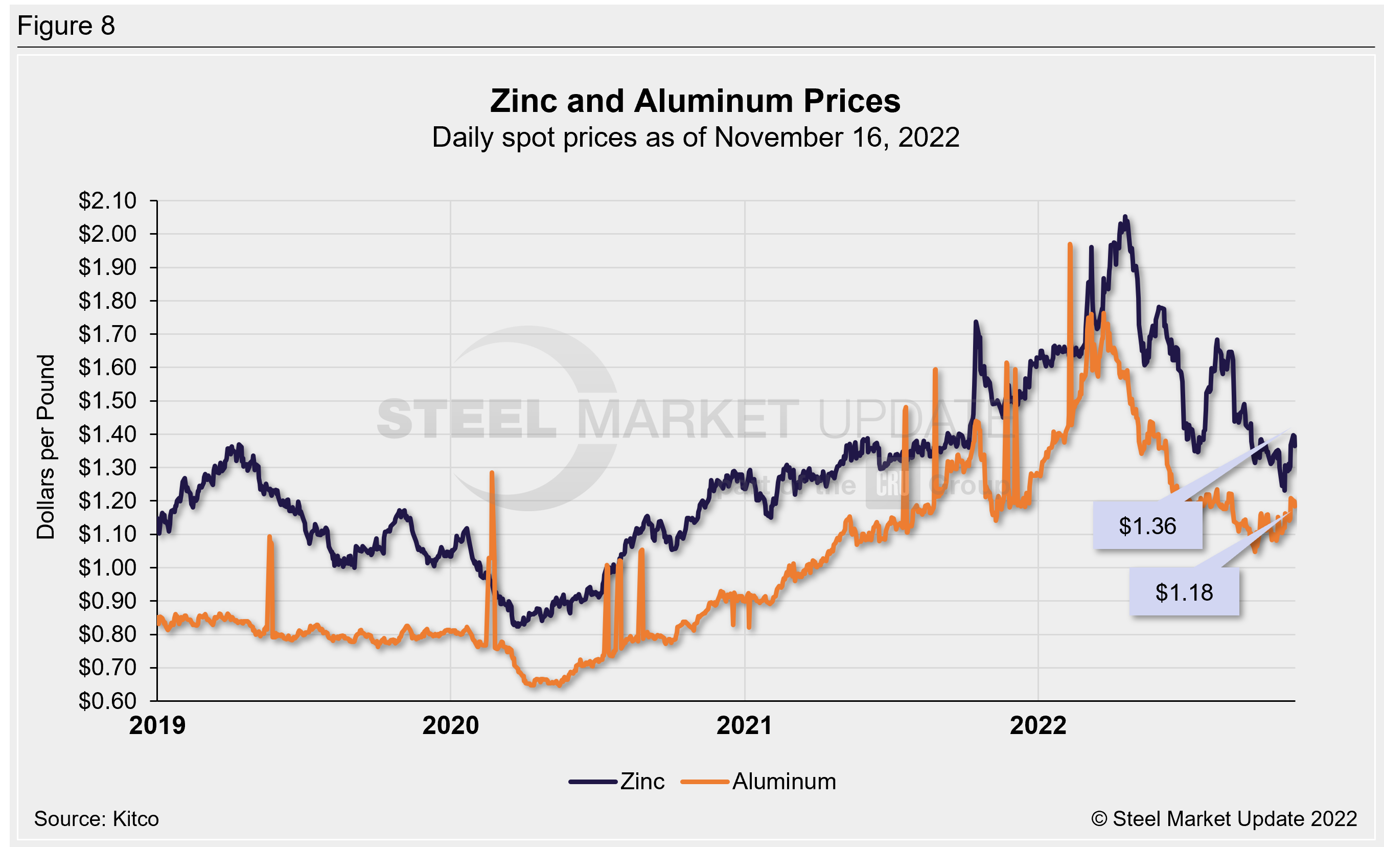 Aluminum prices, which factor into the price of Galvalume, had also been on the rise in 2021 and into early 2022, reaching a record-high of $1.76 per pound on March 23. (Note that aluminum spot prices often have large swings and return to typical levels within a few days, as seen in the graphic below. We do not consider those surges in our overall high/low comparisons.) Aluminum prices had been relatively stable since June, though still higher than pre-2021 levels. On Sept. 27 prices reached a 17-month low of $1.05 per pound. The latest LME cash price has risen to $1.18 per pound as of Nov. 16. Aluminum prices are up 7% from one month prior, in line with July levels, and up 1% from prices one year prior.