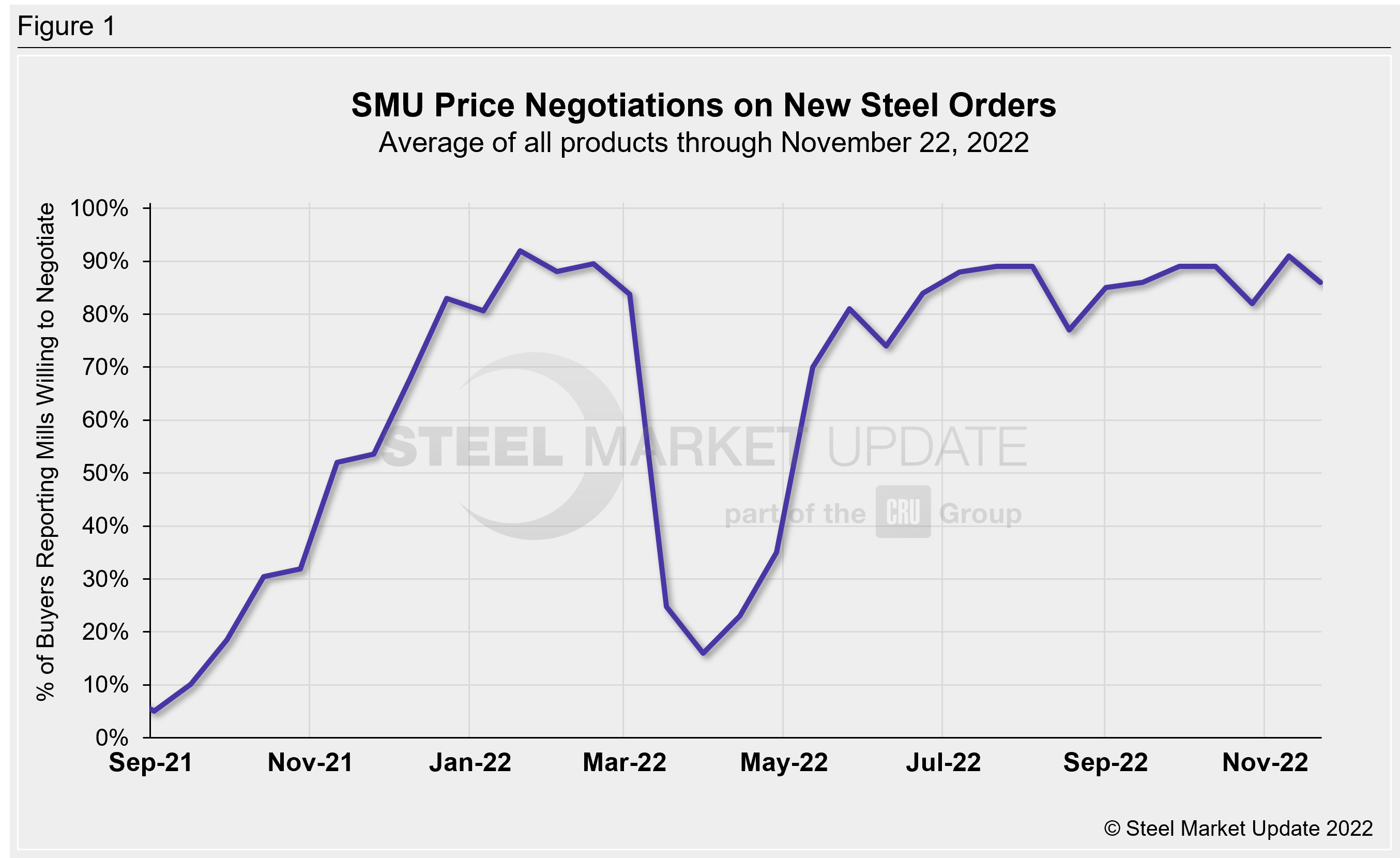 Every other week, SMU asks survey respondents: Are you finding domestic mills are willing to negotiate spot pricing on new orders? On average, 86% of steel buyers polled this week reported that mills were willing to negotiate on new order pricing. Two weeks ago we saw a rate of 91%, the highest rate recorded since January. As shown in Figure 1, negotiation rates have remained relatively high for over six months.