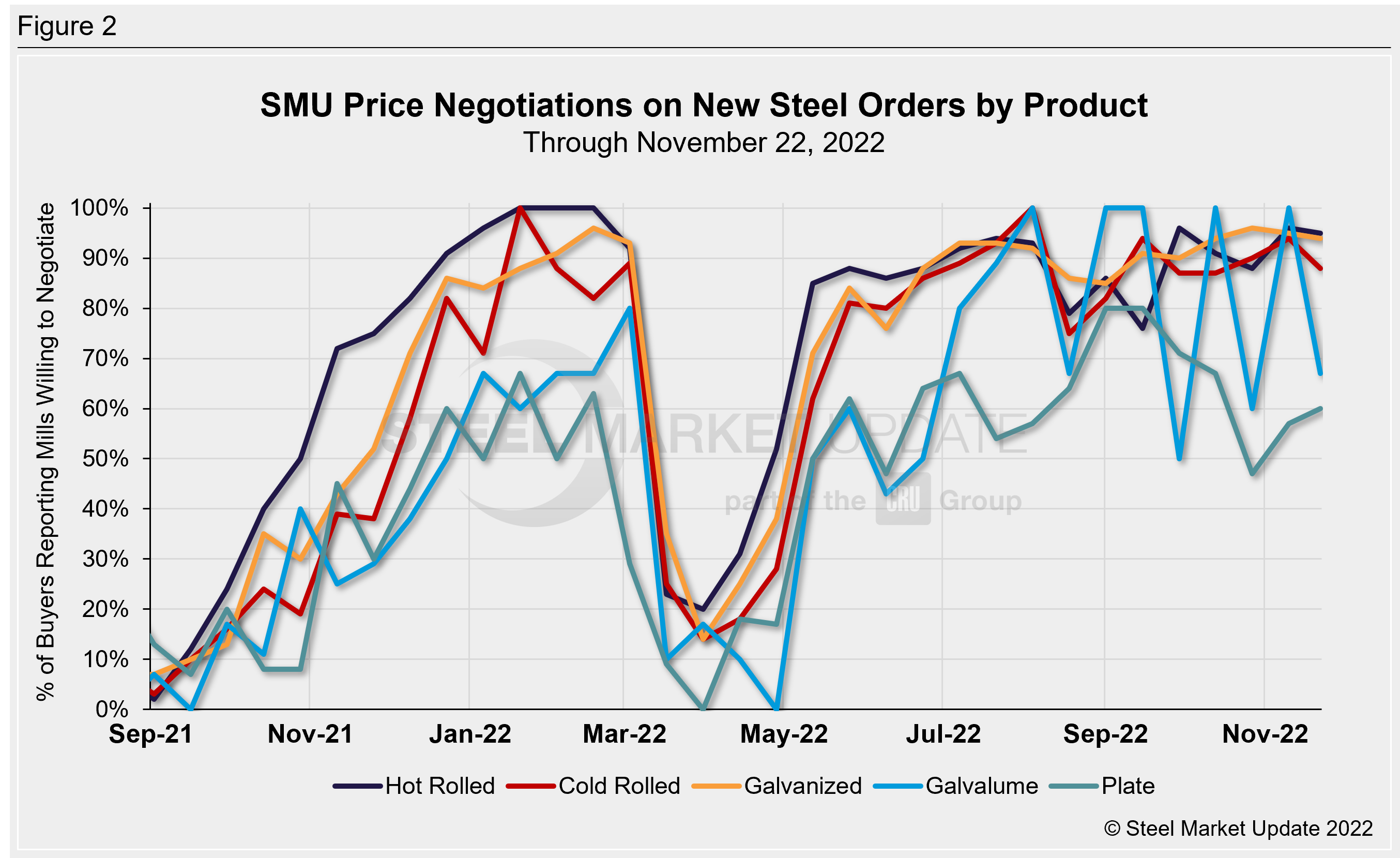 For galvanized buyers, 94% responded that mill prices are negotiable this week. This is down just 1% from two week ago. Recall that in late October our galvanized negotiation rate reached 96%, the highest rate recorded in over eight months. Galvanized negotiation rates have been 90% or higher since mid-September.