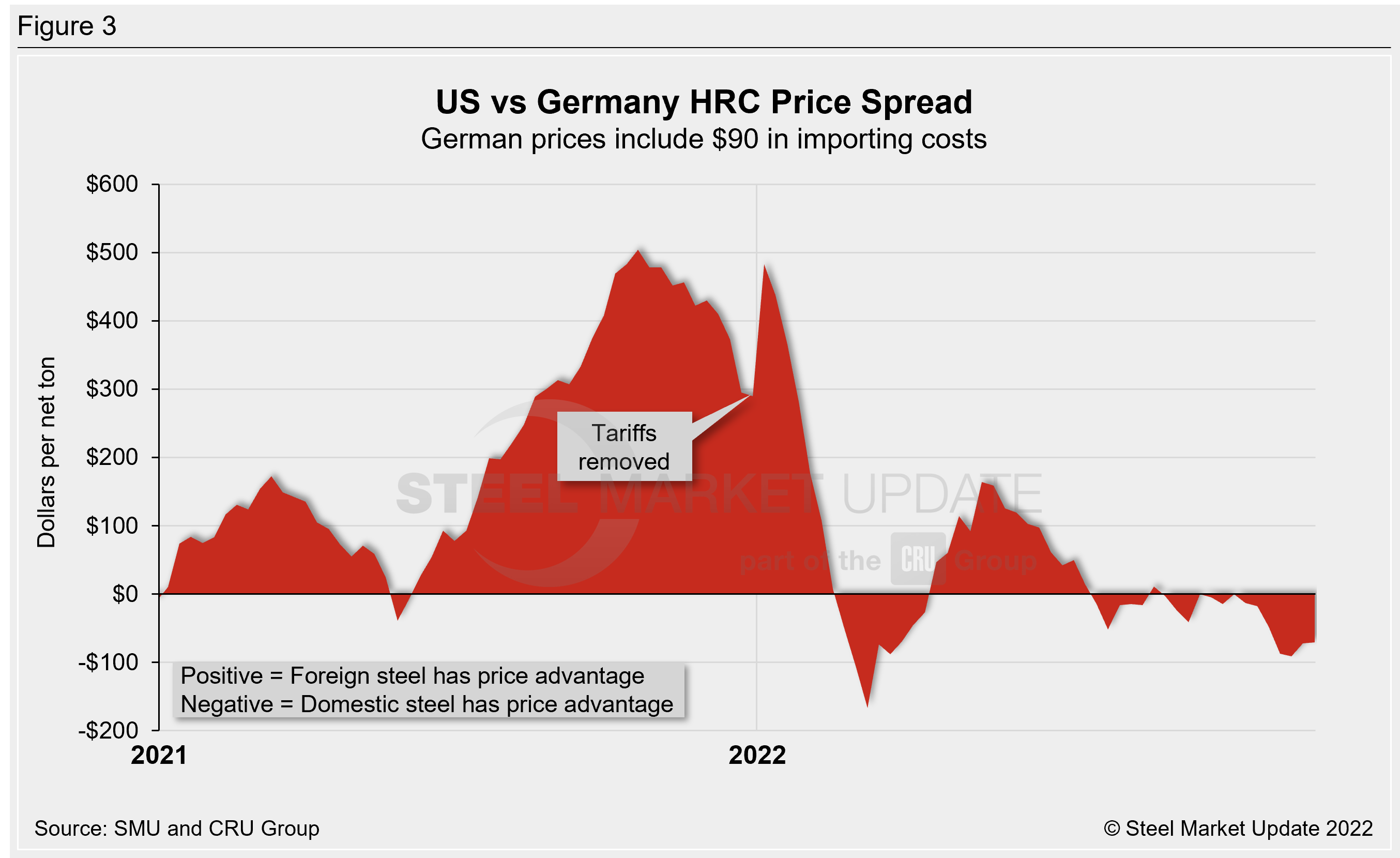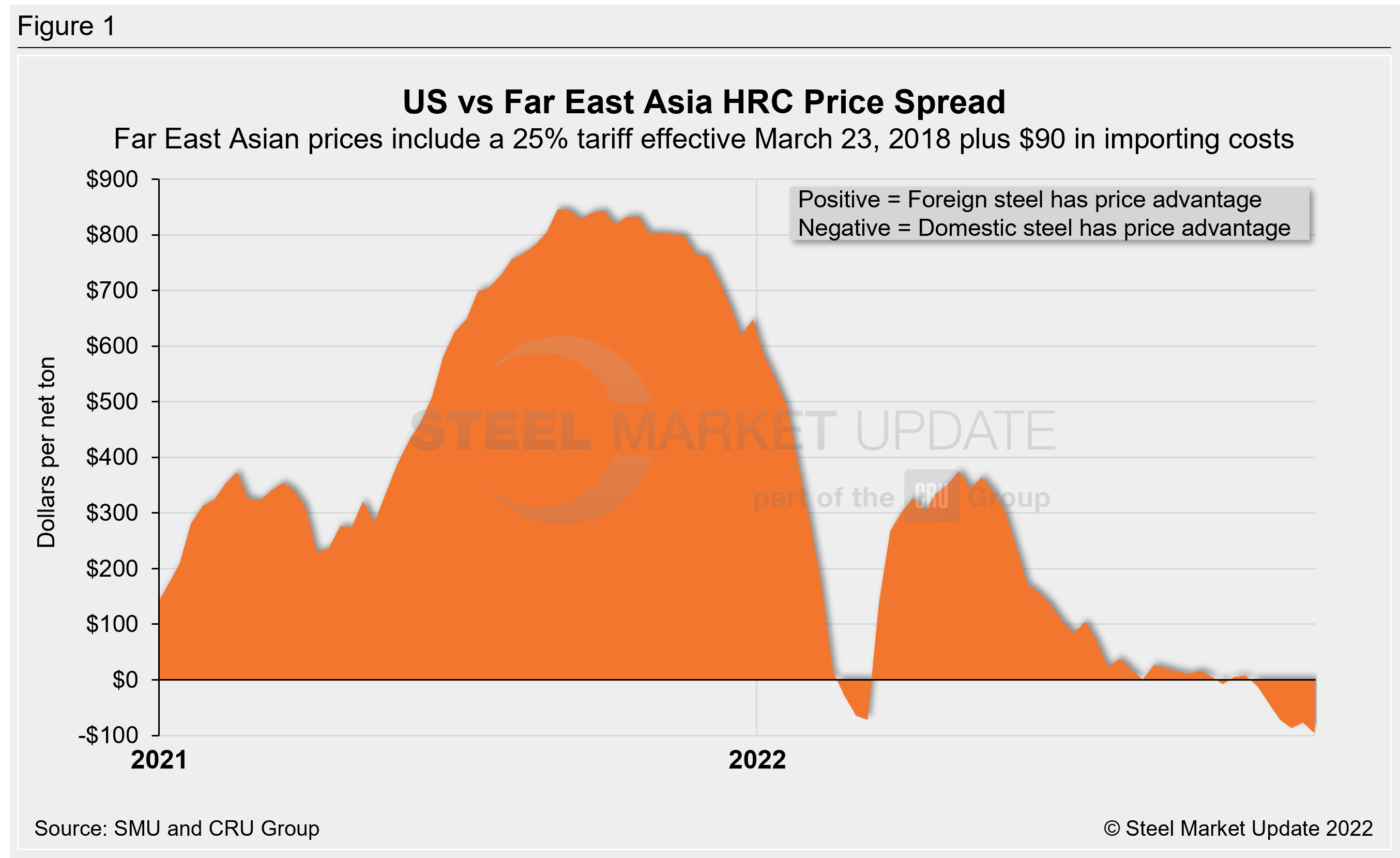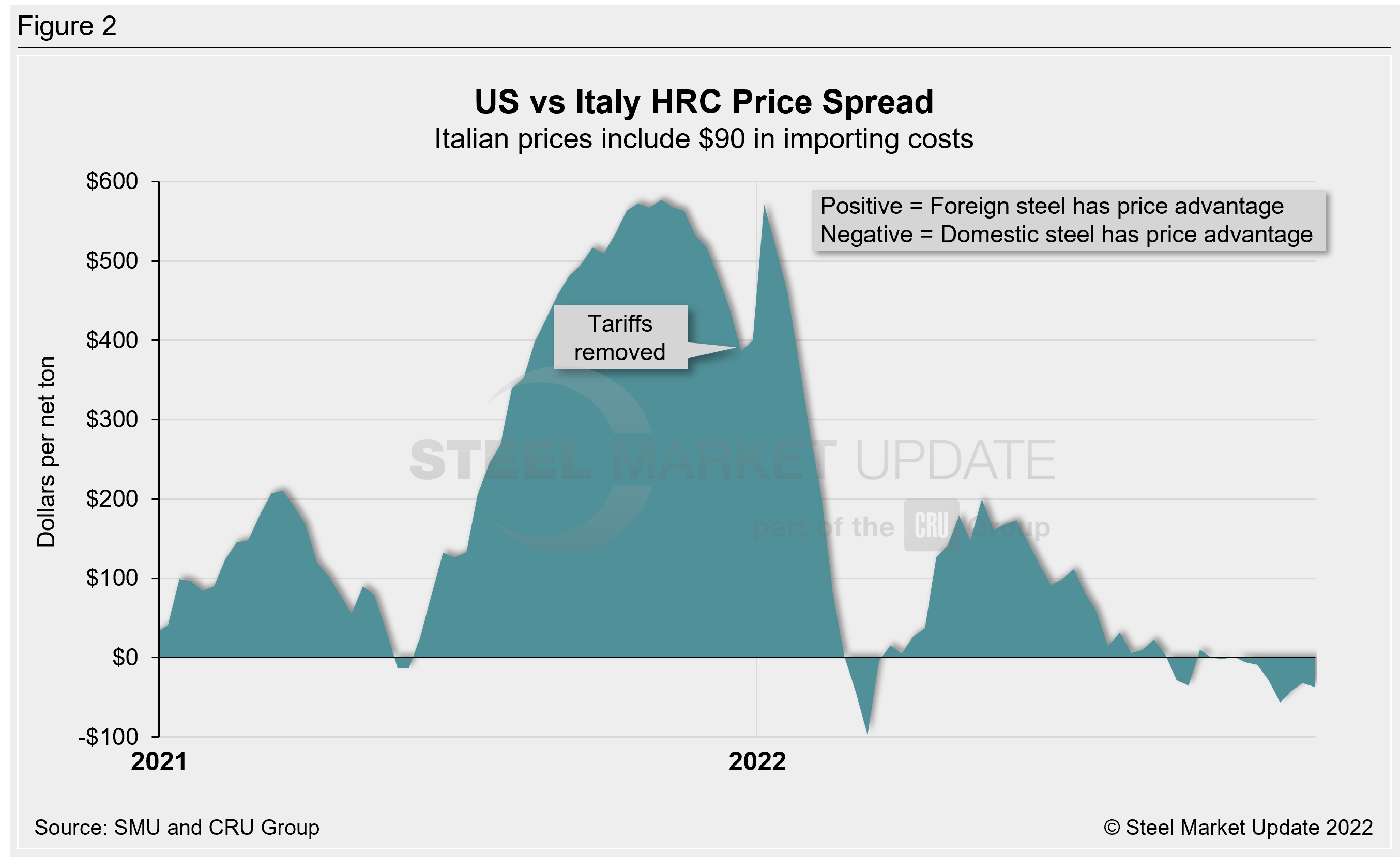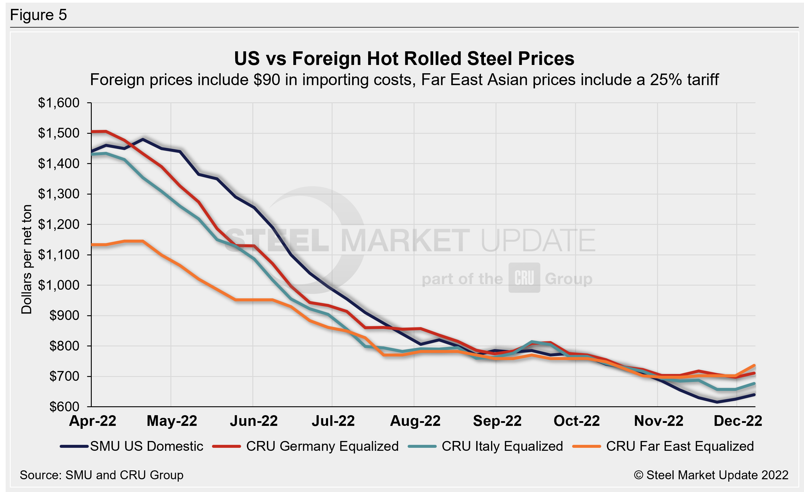 SMU uses the following calculation to identify the theoretical spread between foreign HRC prices (delivered to US ports) and domestic HRC prices (FOB domestic mills): Our analysis compares the SMU US HRC weekly index to the CRU HRC weekly indices for Germany, Italy, and Far East Asian ports. This is only a theoretical calculation because costs to import can vary greatly and often fluctuate, which influences the true market spread.