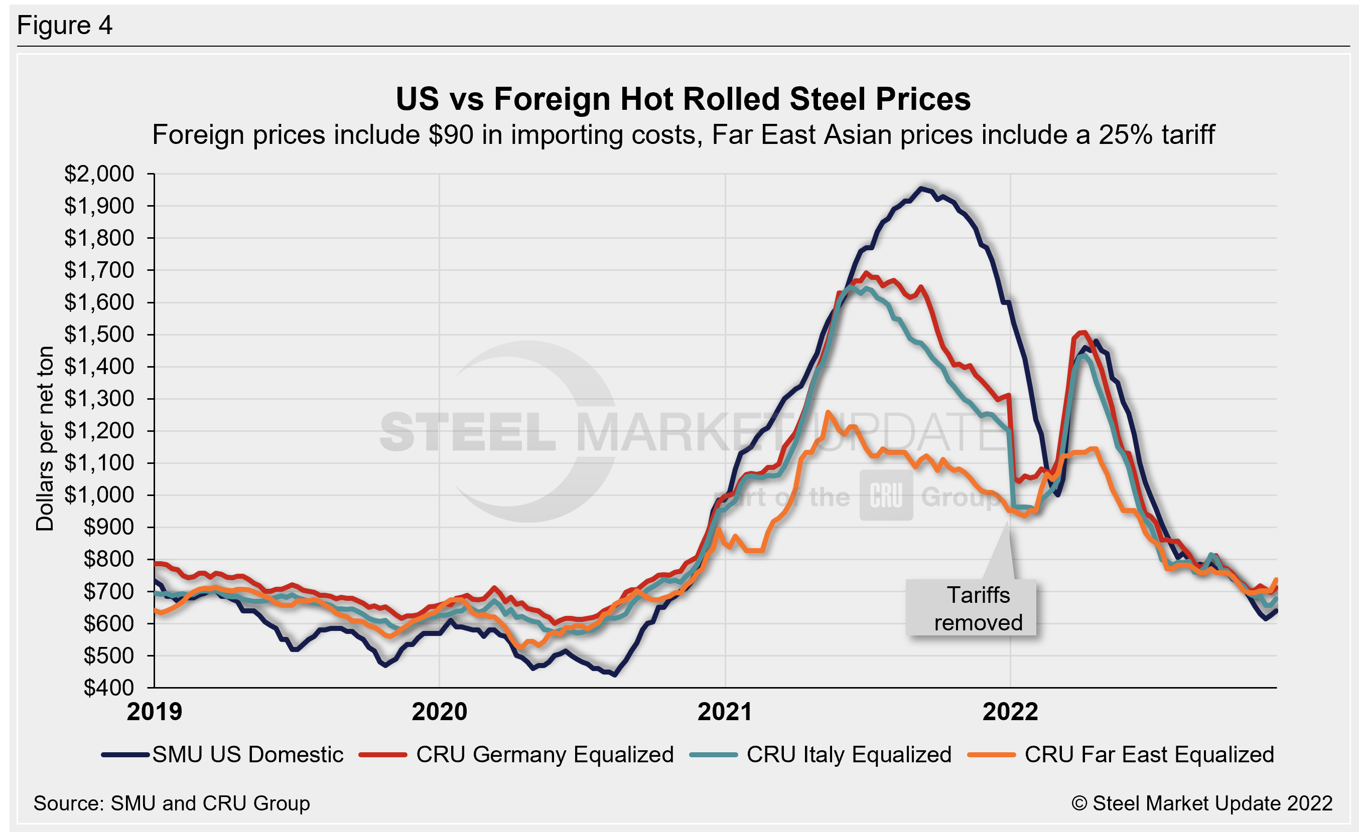 Effective Jan. 1, 2022, the traditional Section 232 tariff no longer applies to most imports from the European Union. It has been replaced by a tariff rate quota (TRQ). Therefore, the German and Italian price comparisons in this analysis no longer include a 25% tariff. SMU still includes the 25% S232 tariff on foreign prices from other countries. We do not include any antidumping (AD) or countervailing duties (CVD) in this analysis.