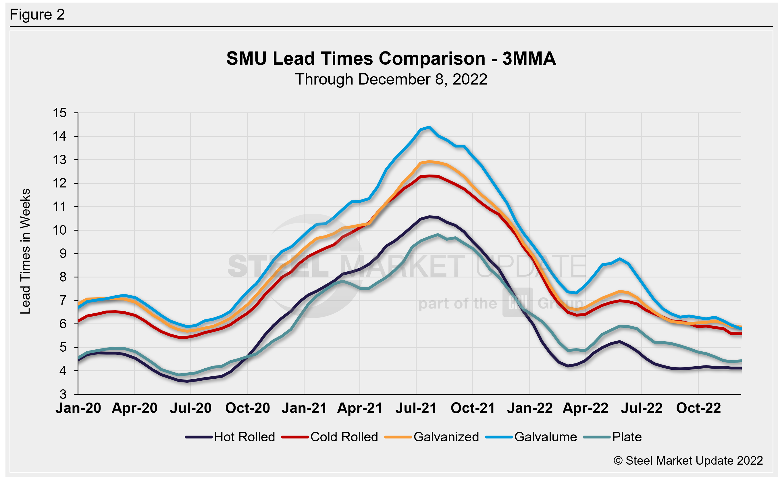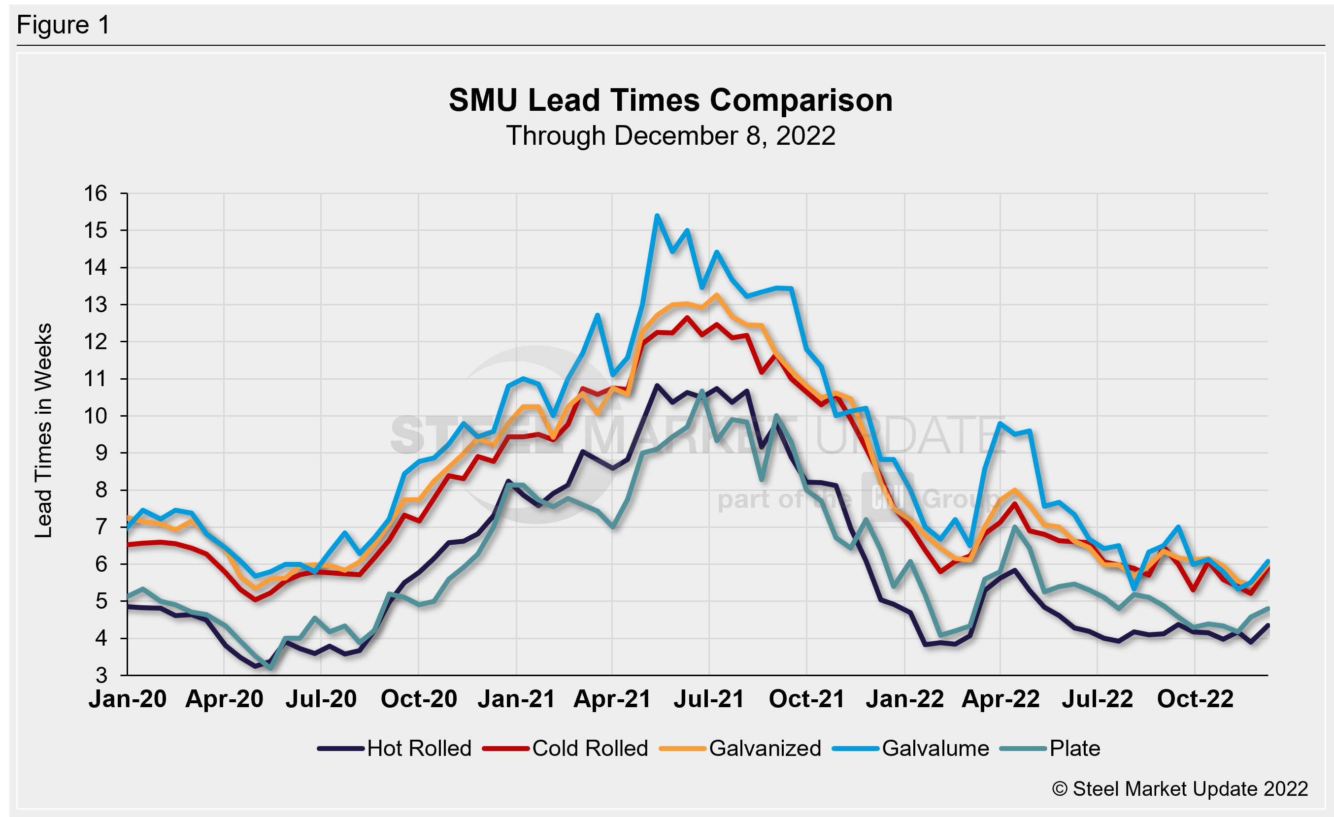 Cold rolled lead times jumped 0.7 weeks to 5.9 weeks, now the highest level since mid-October. We saw the cold-rolled lead times at 5.2 weeks in late November, the lowest recorded since May 2020. One month ago, cold-rolled lead times were at 5.4 weeks.