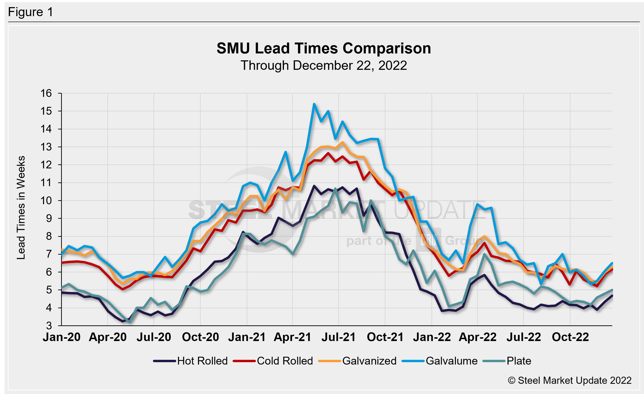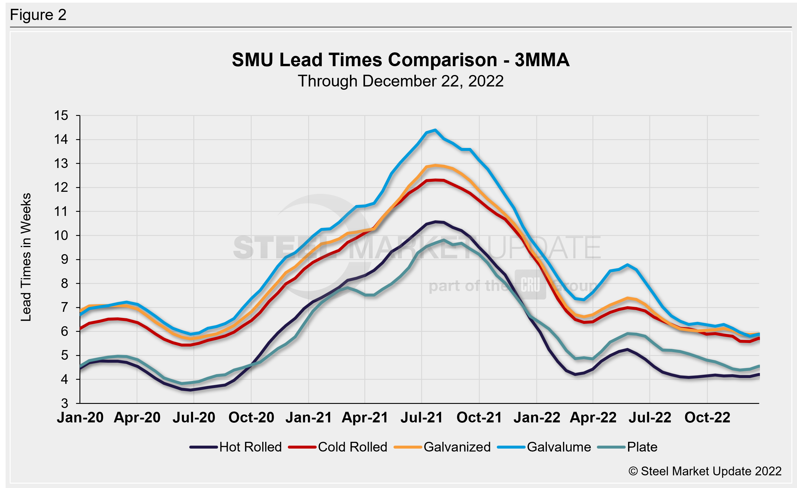 Cold-rolled lead times also lengthened by 0.3 weeks to 6.2 weeks and are now at the highest level since early September. Cold-rolled lead times fell to 5.2 weeks in late November, the lowest reading since May 2020.