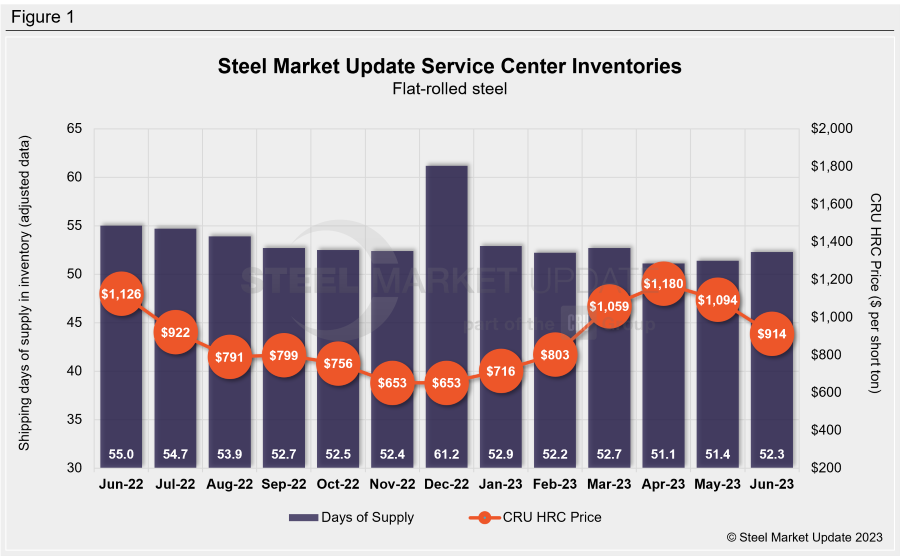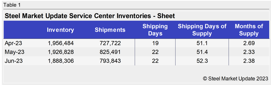 US service center flat-rolled steel supply edged up slightly in June as daily shipments dropped to the lowest rate this year. At the end of June, service centers carried 52.3 shipping days of supply, according to adjusted SMU data. This is up from 51.4 shipping days in May. Flat-rolled steel inventories represented 2.38 months of supply in June, nearly flat compared with 2.33 months of supply in May. There were 22 shipping days in both May and June, respectively.