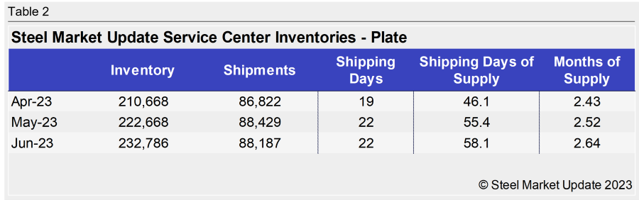 US service center plate inventories grew again in June with slowing shipments. Similar to sheet, the daily shipping rate for plate fell to the lowest level seen this year. At the end of June, service centers carried 58.1 shipping days of plate supply, up from 55.4 shipping days in May. Plate inventories represented 2.64 months of supply in June, up from 2.52 months in May.
