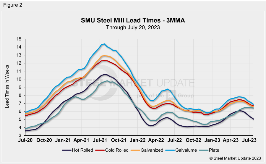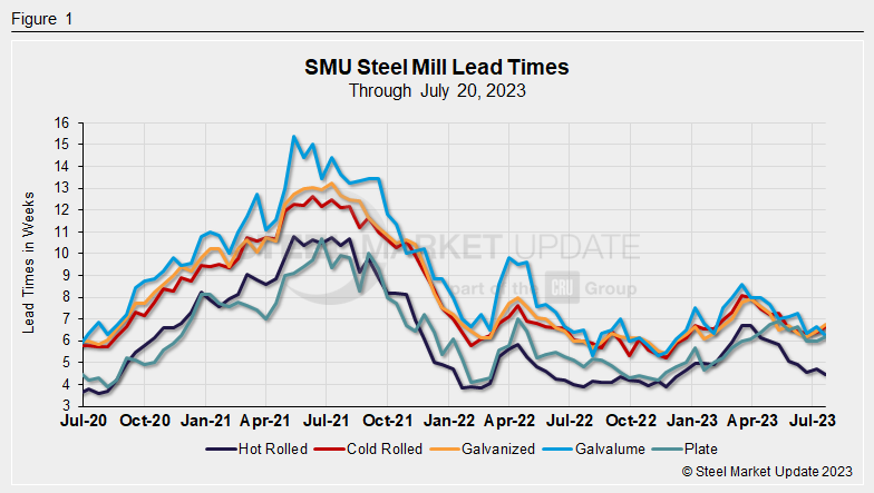 Movements in lead times were mixed this week, with those for hot rolled and Galvalume falling back marginally, and those for cold rolled, galvanized, and plate extending slightly.