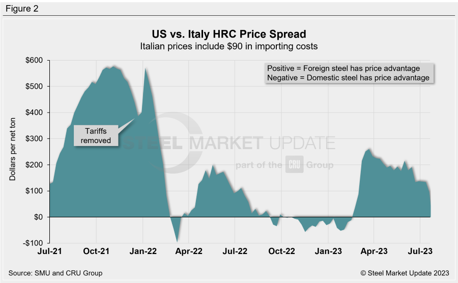 Effective Jan. 1, 2022, the traditional Section 232 tariff no longer applies to most imports from the European Union. it has been replaced by a tariff rate quota (TRQ). Therefore, the German and Italian price comparisons in this analysis no longer include a 25% tariff. SMU still includes the 25% Section 232 tariff on foreign prices from other countries. We do not include any antidumping (AD) or countervailing duties (CVD) in this analysis.