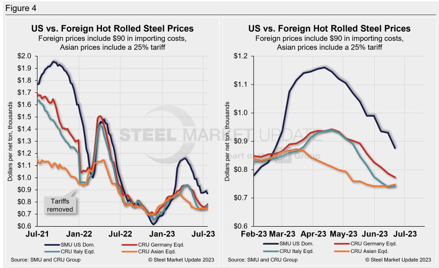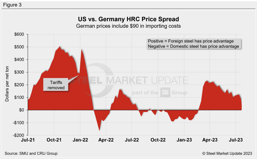 Domestic hot band is now roughly 11.6% more expensive than foreign material, down from 15.2% a week ago. While it’s still unclear if domestic mills were successful in their latest efforts to increase prices, margins between domestic product and offshore hot band has fluctuated due in part to seasonally slower summer months.