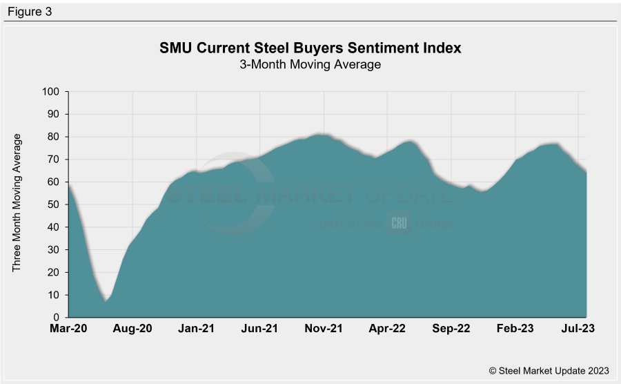 SMU’s Current Buyers Sentiment Index was flat at +64 this week. (Figure 1). Current sentiment hasn’t cracked +70 since the beginning of May after hovering in the mid-70s since the middle of January.