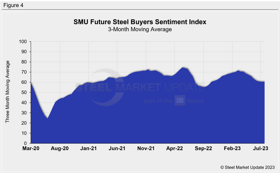 SMU’s Future Buyers Sentiment Index measures buyers’ feelings about business conditions three to six months in the future. This week, the index rose three points to +64 vs. the previous market check (Figure 2). The future and current indices were last running even at the beginning of March when they both stood at +76.