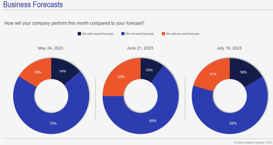Recall mills in June announced $50-per-ton price hikes in mid-June and target HRC prices of $900-950 per ton, depending on the mill. In late June, nearly 40% of survey respondents thought HRC prices would climb above $900 per ton. Now only 20% think that threshold will be crossed.