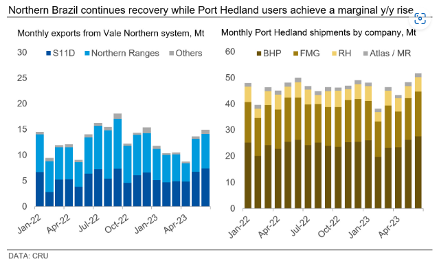Iron ore supply from Australia has seasonally slowed after the financial year end with some companies undertaking port maintenance, but overall exports have remained stronger y/y. Exports from northern Brazil rose again m/m after moisture levels returned to manageable levels after the end of the rainy season, though this very high export level will reverse as the large stockpiles at mines get drawn down.
