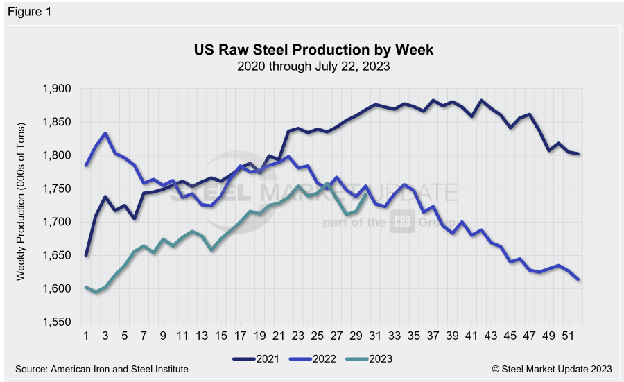 Steel production in the US rose to 1,741,000 net tons for the week ended July 22, up 1.5% from 1,716,000 the previous week. Domestic production is also up 1.2% year-over-year from 1,721,000 net tons in the same week of 2022.