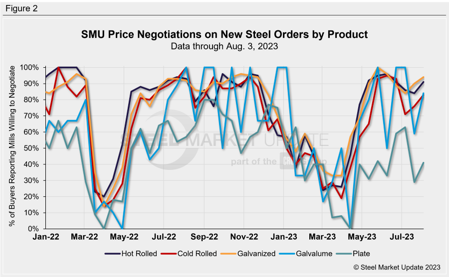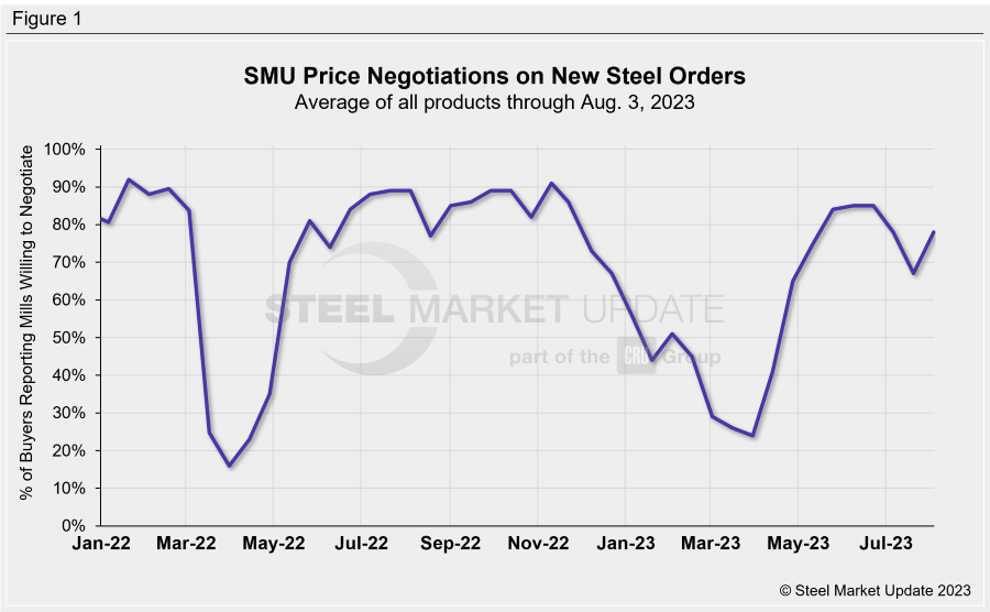Every two weeks, SMU asks steel buyers whether domestic mills are willing to negotiate lower spot pricing on new orders. This week, 78% of steel buyers (Figure 1) in our survey reported mills were willing to negotiate price on new orders, up from 67% two weeks earlier. The previous market check was the last time the rate dipped below 70% since the end of April.