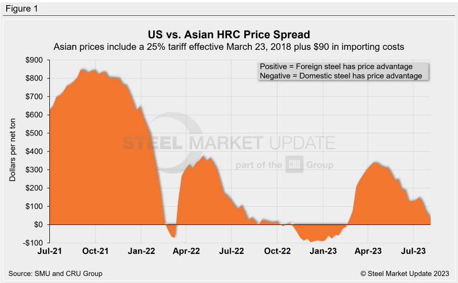 US-produced HRC is now theoretically $45 per ton more expensive than steel imported from Asia. That figure is down $26 per ton week-on-week (WoW).