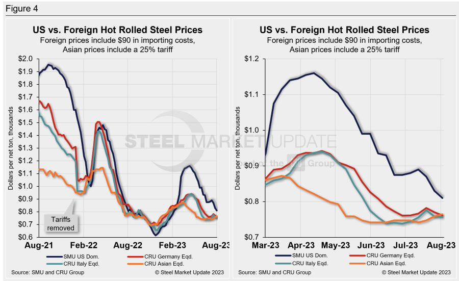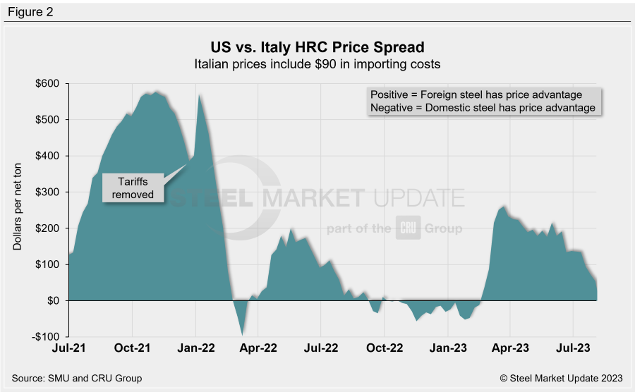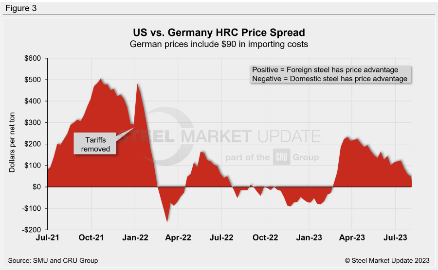Domestic HRC is now theoretically $49 per ton more expensive than imported German HRC. That’s down $11 per ton WoW, and down $21 per ton vs. one month ago.