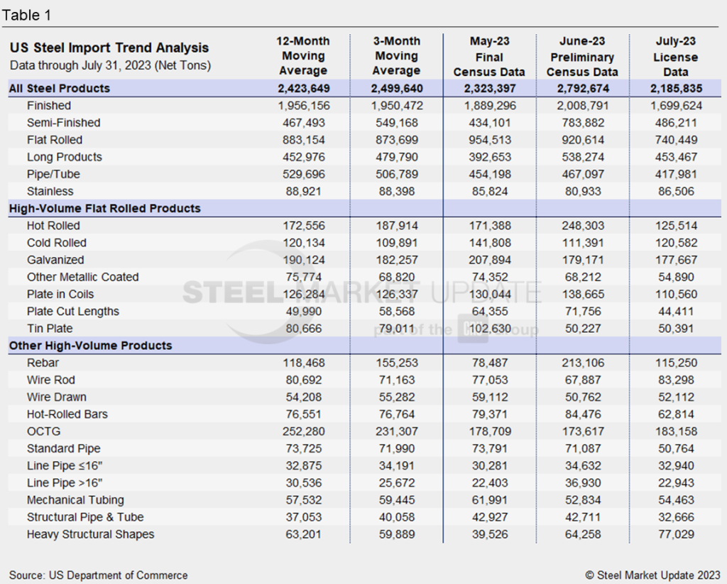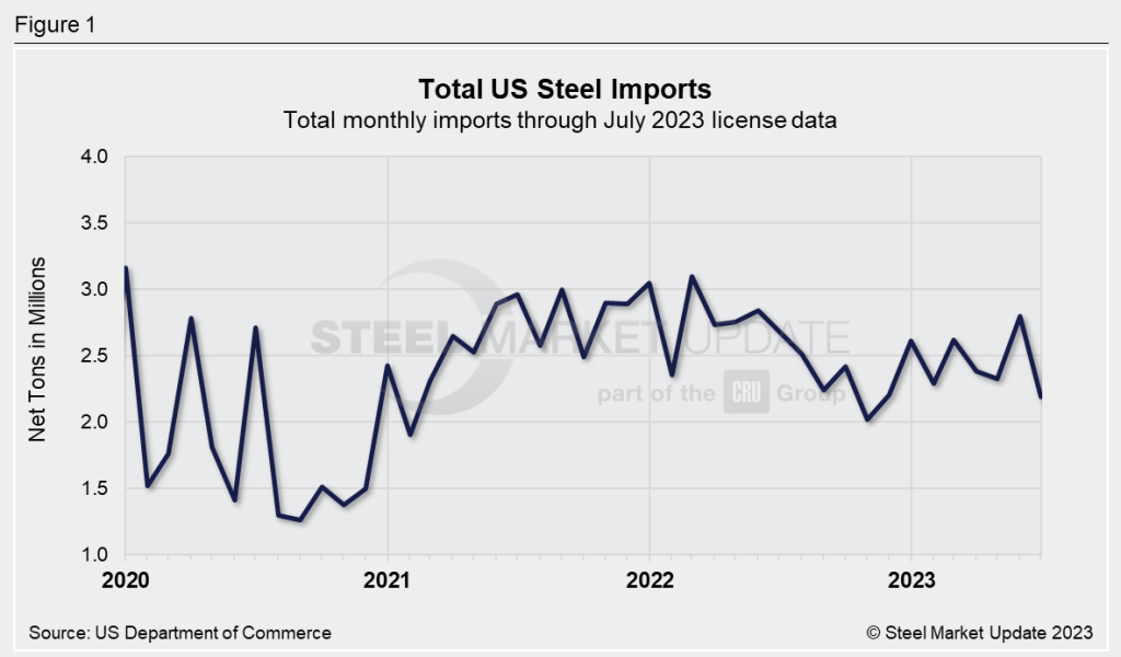 Commerce counted 2,185,835 net tons of licenses to import steel for July. Compared to June’s preliminary import count, this is a 22% month-on-month (MoM) decline. July’s count is the lowest in eight months and is down 18% from July 2022 (see Fig. 1)