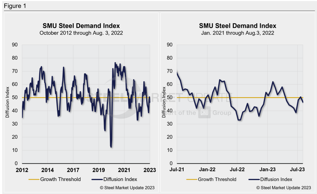 An index score higher than 50 indicates an increase in demand and a score below 50 suggests a decrease. Detailed side-by-side in Figure 1 are both the historical views and the latest Steel Demand Index.