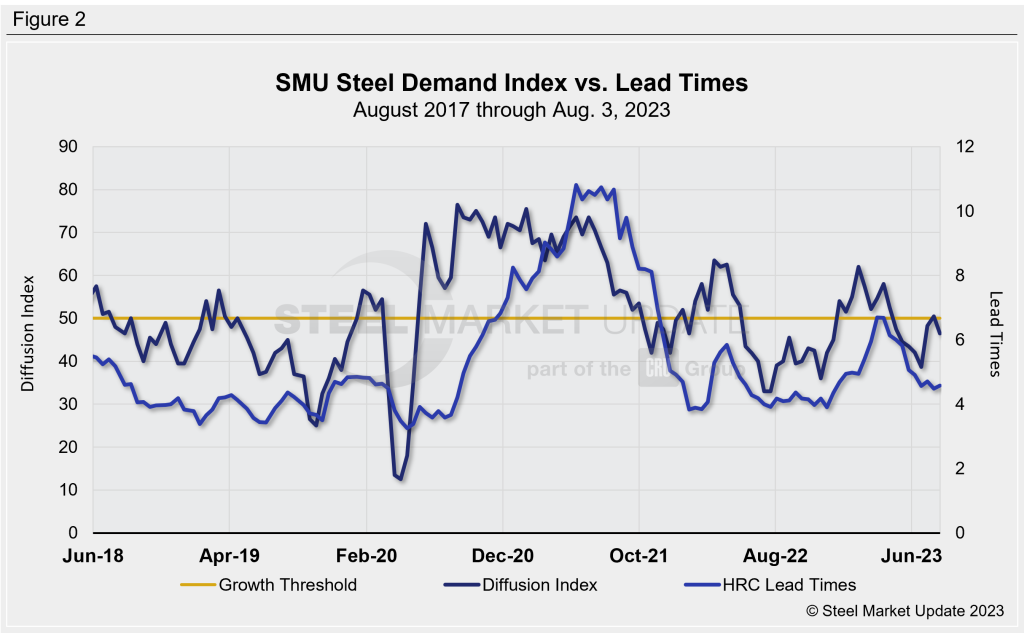 The index, which compares lead times and demand, is a diffusion index derived from the market surveys we conduct every two weeks. This index has historically preceded lead times, which is notable given that lead times are often seen as a leading indicator of steel price moves.