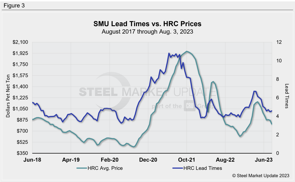 SMU’s demand diffusion index has, for nearly a decade, preceded moves in steel mill lead times. (Figure 2 shows the past five years.) Historically, SMU’s lead times have also been a leading indicator for flat-rolled steel prices, and HRC prices in particular. (Figure 3 features the past five years.)
