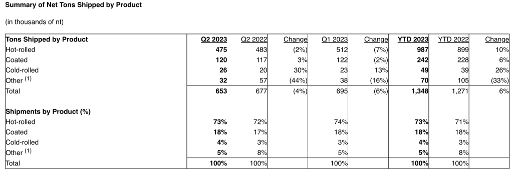 All told, the Hamilton, Ontario-based company posted net income of Canadian $117 million (USD$87 million) in Q2’23, off 79% from CAD$554 million a year earlier on revenue that fell 19% to CAD$841 million (USD$627 million). However, Stelco swung to a profit after losing CAD$11 million in Q2’22 on revenue of CAD$687 million.