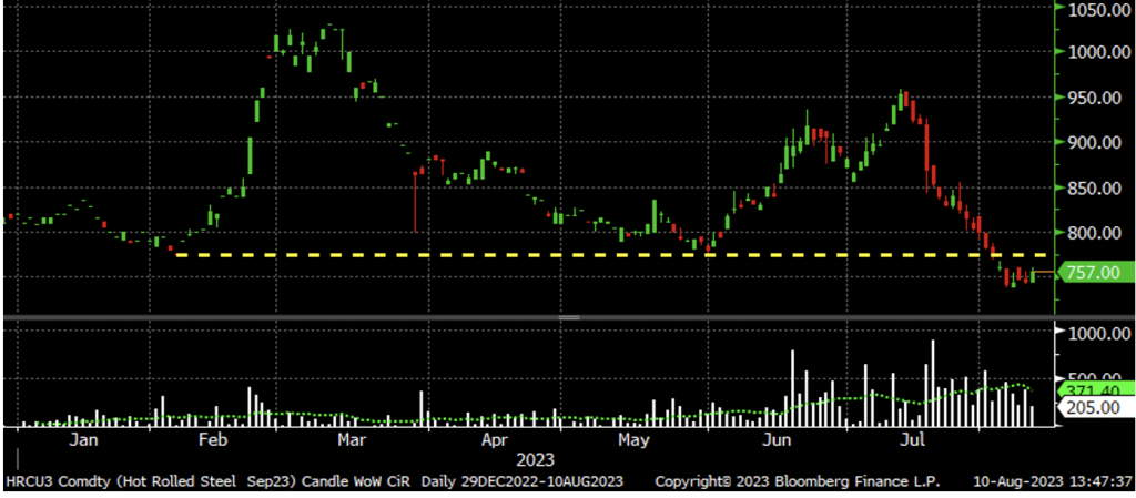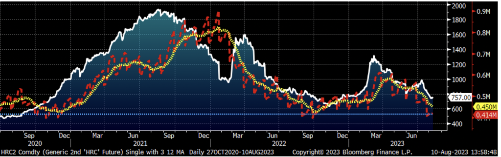 I like to say “keep an open mind” about prices. Will HRC test last year’s low of $621? Could it fall to a new low? I have had these discussions and a common response has to do with domestic mill’s costs, specifically scrap. Scrap will move with iron ore and iron ore is directly affected by China’s steel market. There was a brief and fleeting moment of optimism in mid-July that China’s government was going to save the day with one of their good old-fashioned shock-and-awe economic stimulus packages. That has not manifested, while China’s economic data continues to rapidly deteriorate.