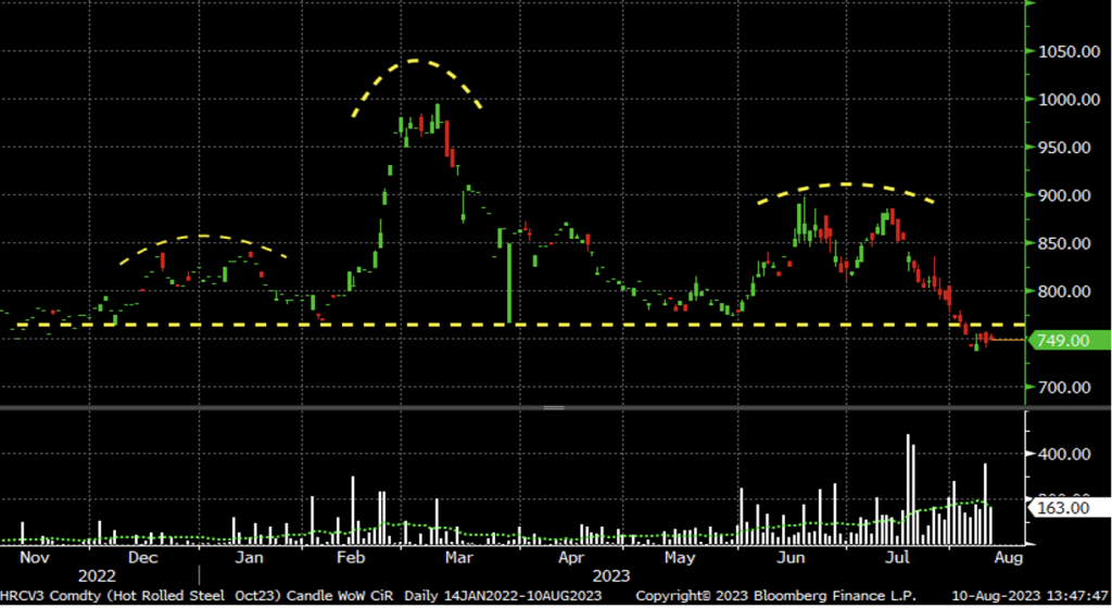 Iron ore rebounded from May’s lows around $95 back to $115 by mid-June. The rally lost momentum, falling back to around $103 on July 10 before being lifted back to $115 fueled by said optimism. However, it has since fallen back to the $100 area this week while breaking below its nascent up trendline. Keep an eye on the $90-95 support level, for if ore breaks below it, just like in examples above, it will likely have to fall sharply to a level that entices buyers to step back in. Why do we care? If ore falls, Turkish scrap and busheling will likely go down with it. Once again, keep an open mind about prices.