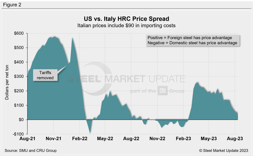 Domestic HRC is now theoretically $46 per ton more expensive than imported Italian HRC. That is a far cry from late March, when US tags were $260 per ton higher than those for Italian hot band.