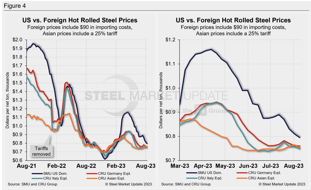 Domestic hot band is now roughly just 5% more expensive than foreign material. It was 15% more expensive just a month ago. Repeated domestic mill price hikes in early 2023 had resulted in US prices becoming nearly 23% more expensive than imports in Q1.