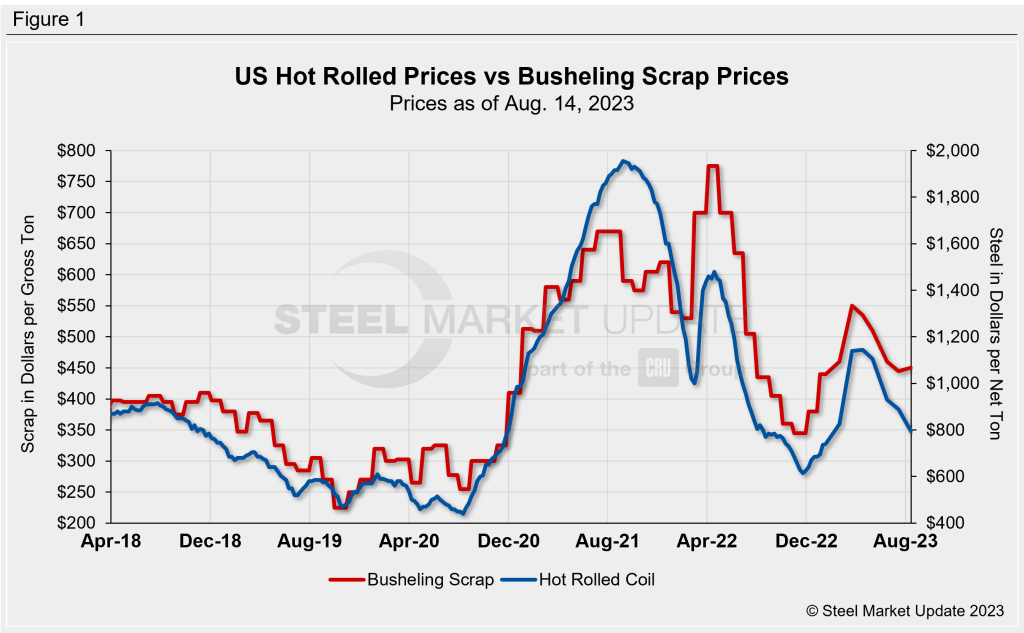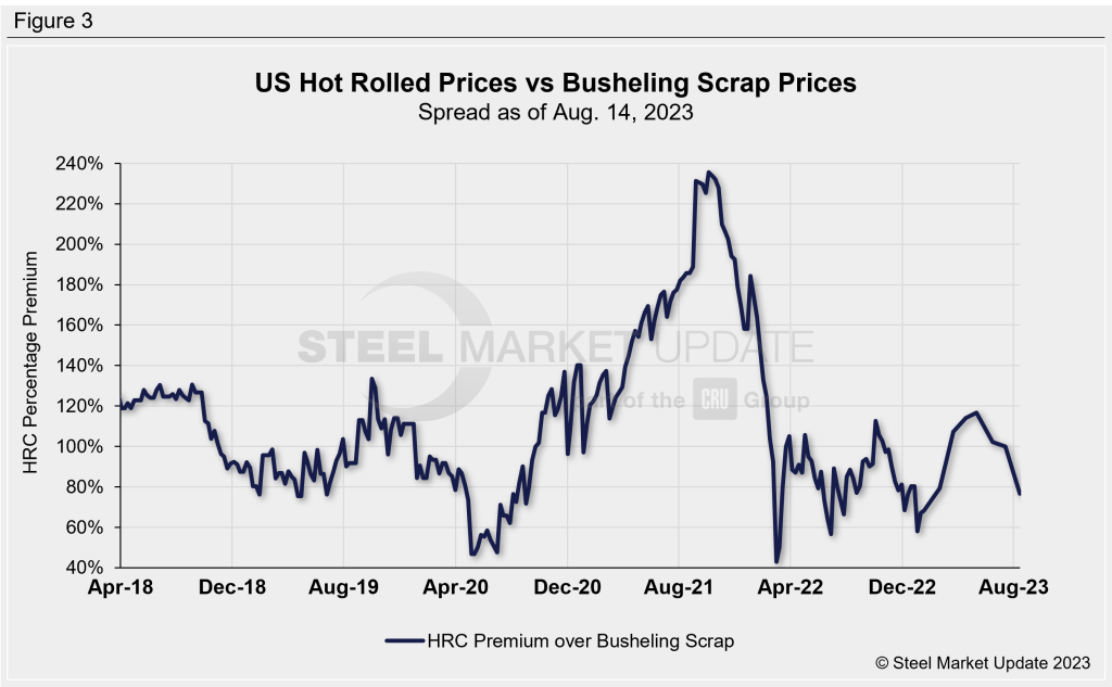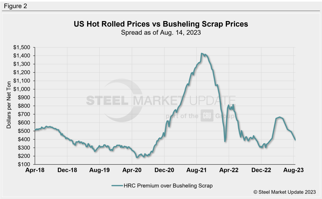 After converting scrap prices to dollars per net ton for an equal comparison, the differential between HRC and busheling scrap prices is $393 per net ton as of Aug. 14, down $100 from a month earlier. (Figure 2). This is the fourth consecutive month where the spread has narrowed.