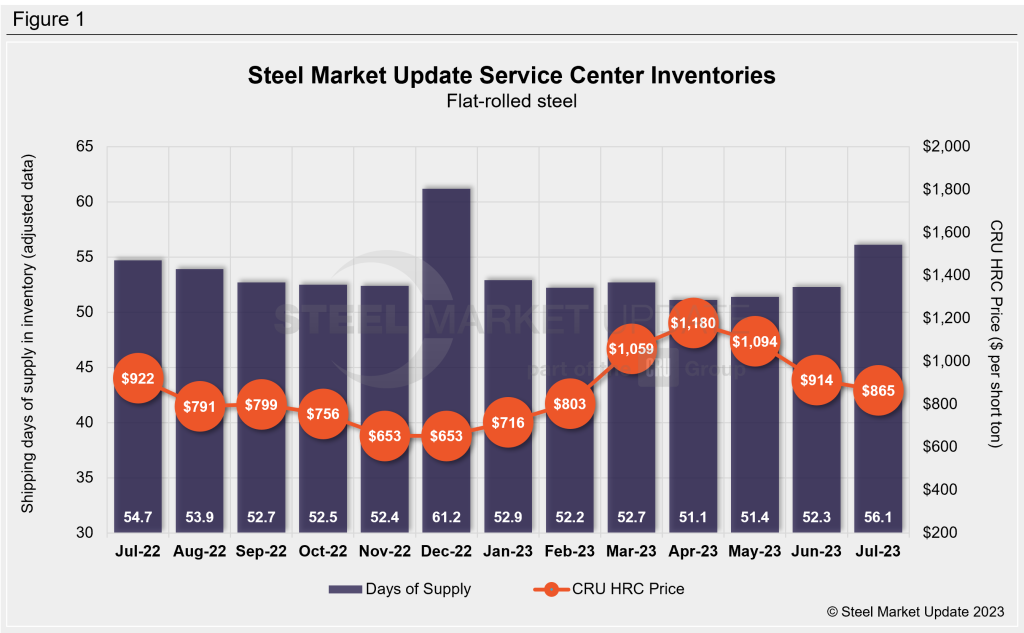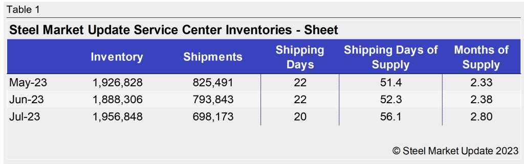 US service center flat-rolled steel inventories spiked in July with a slowdown in shipments. At the end of July, service centers carried 56.1 shipping days of flat roll supply, according to adjusted SMU data. This is up from 52.3 shipping days of supply in June. In terms of months of supply, flat-rolled steel on hand represented 2.8 months of supply, up from 2.38 months in June.