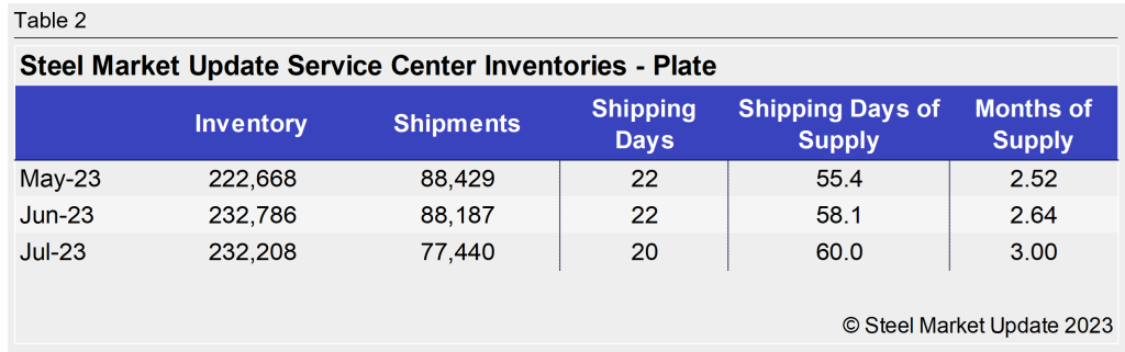 Considering the lower amount of material on order and seasonally slower July, plate inventories appear to be mostly balanced, or slightly high. Steady inventories have helped to keep prices flat, though the ongoing balance will depend on how much shipments recover in August.