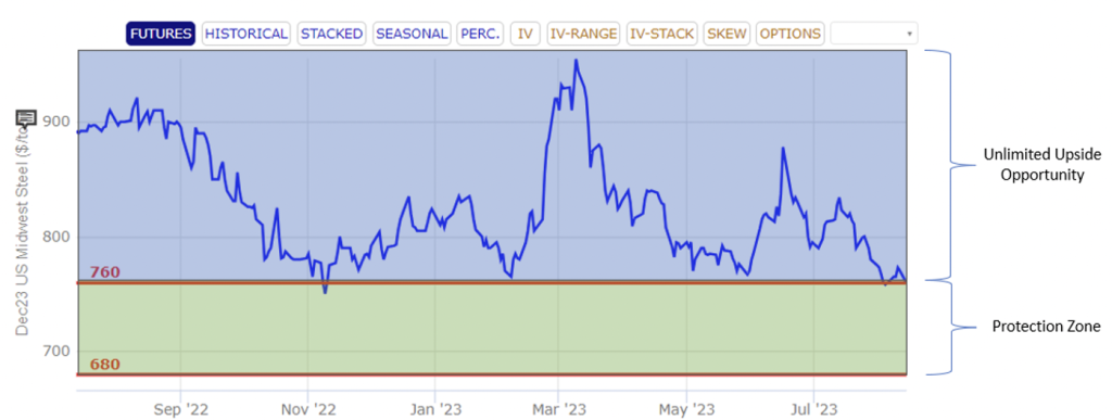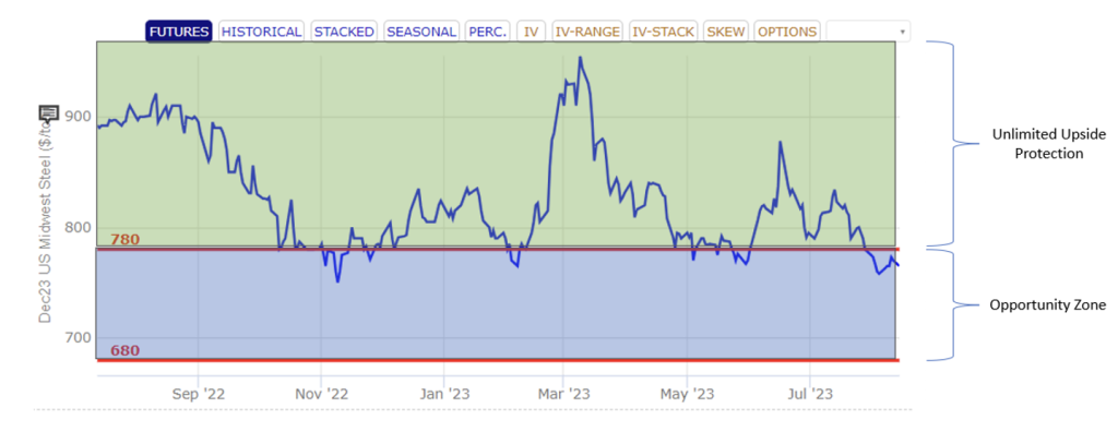 The magnitude of the move could warrant a futures position for many buyers, but if further downside is believed to be plausible, an alternative strategy might be an upside collar. An upside collar involves the simultaneous purchase of an at-the-money call and the sale of put below the market. The sale of the put reduces the initial cost of the strategy. Using theoretical pricing in December HRC options, buying the $780 call and selling the $680 put is expected to cost about $26 per ton or $520 per contract. The position would be susceptible to margin calls if the market continued to drop. While the position would lose money in the case of a market drop, a portion of those losses would be offset with cheaper raw material prices in the physical market.