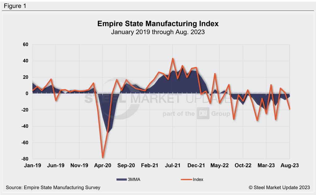 The headline general business conditions index dropped 20.1 points to -19.0 in August vs. July, the first negative reading since May, the August survey, compiled from responses between Aug. 2 and Aug. 9, said. The new orders index fell 23.2 points to -19.9 in the same comparison, while the shipments index dropped 25.7 points to -12.3.