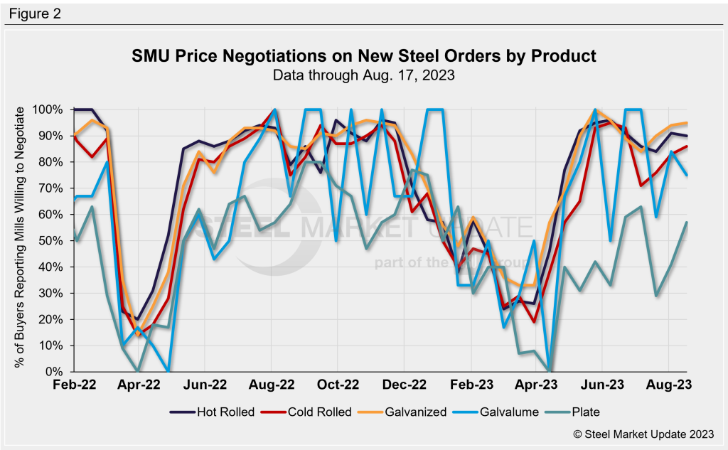 Every two weeks, SMU asks steel buyers whether domestic mills are willing to negotiate lower spot pricing on new orders. This week, (Figure 1) 80% of participants surveyed by SMU reported mills were willing to negotiate price on new orders, rising two percentage points from two weeks earlier. This is the first time it’s topped 80% since the end of June.