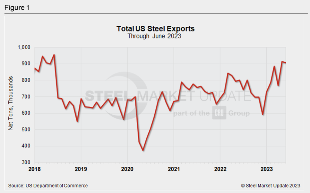 US steel exports remained elevated during the month of June, staying above the 900,000-ton mark for a second consecutive month.