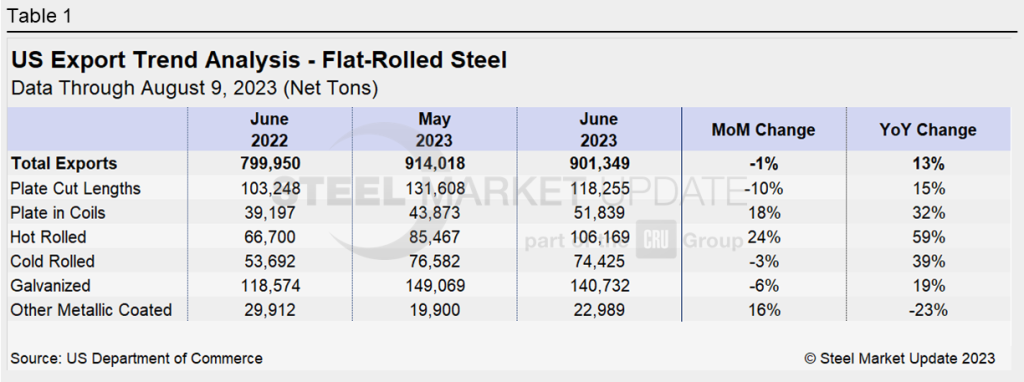 June flat-rolled steel exports were well above year-ago levels, except for the other metallic coated category (Table 1).